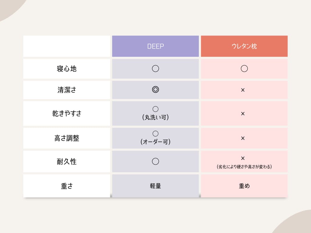 近年はウレタン枕の使用が一般的になりましたが、唾液や汗にさらされる枕は菌やダニなど虫の温床になります。DEEPはパイプ材と乾きやすいカバー生地を採用しているので丸洗いが可能。洗濯+天日干しにより清潔に保ち、菌や虫の繁殖を防ぐことができるのでとても衛生的です。