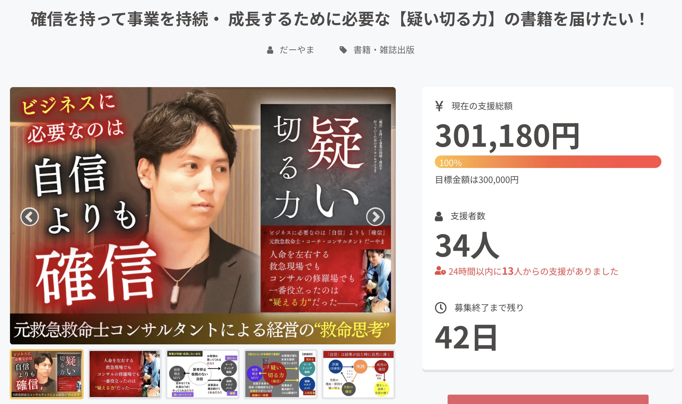 3日で100%を達成しました!本当に皆さまのおかげで、このような結果を得られることが出来ました。 ありがとうございます! そして次の目標が、「100人に届ける」です!! だーやまは、疑いに疑いまくって、 「揚げ足・屁理屈・アラ探し」を繰り返してきました。 「自信をつけると成功するのか?」「感謝をすれば成功するのか?」「比較はダメってほんまなん?」「強みを発掘しても皆失敗してない?」 などなど・・・ 成功しない、幸せになれていない、多くの方達を目の当たりにしてきたからです。 本書にも書いてますが、「自信」が1番必要ないし、「自信」がない人なんて居ません。 ちゃんと”疑い切る“ことをして、得た確信をこの本に詰め込んでいます。 今まさに壁に当たって悩んでいる方、上手くいかず迷っている方、もっとビジネスを伸ばしたい方、5年後にビジネスを残したい方、 など・・・・ 多くの方に読んでいただき、皆さんのビジネスだけでなく、もっと言えば自分の人生に責任をとれるような、かっこいい生き様の人を増やしたいと考えています。 是非、アンケートへの回答と、ご紹介をよろしくお願いします!
