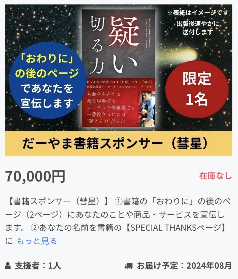 ご支援いただいた皆さま、本当にありがとうございます。 100%を達成した次は、「100人の方に書籍を届ける」ことを目標にしています。 今回の本は、「最初から最後まで読む」といったものではありません。 目次をみて「ピンッ!」ときた、内容を読んでいただきたいのです。 それが、「ざわざわ」「もやっ」でもいいですし、 「びびっ」「キュイーン!」でもいいです。w 気になる一節、お気に入りの一節、好きな一節を見つけてください♪ そしてその一節を、「仲のいい友人」「仕事の同僚」「大切な家族」などに、 また、「悩んでいる」「壁にぶつかっている」「挑戦をしようとしている」 そんな方にシェアやアウトプットをしてください。 PDF版は無料で、プレゼントしてOKですので! まずはあと60人の方に、届けていきたいので、是非よろしくおねがいします! ぞしてリターンの「だーやまスポンサー(彗星)」の限定数の設定を「1」にできていませんでした。 「自分もまだ購入できるの?」と思わせてしまっていたらすみませんでした。(現在、限定数を1にし、ソールドアウトとなっております)