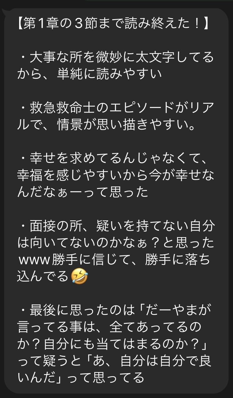 現在112%まできました!本当に皆さんありがとうございます。 また少しずつですが、読んだ方の感想をいただいてます! 【第1章の3節まで読み終えた!】・大事な所を微妙に太文字してるから、 単純に読みやすい・救急救命士のエピソードがリアルで、 情景が思い描きやすい。・幸せを求めてるんじゃなくて、 幸福を感じやすいから今が幸せなんだなぁーって思った・面接の所、疑いを持てない自分は向いてないのかなぁ? と思ったwww勝手に信じて、勝手に落ち込んでる・最後に思ったのは「だーやまが言ってる事は、全てあってるのか? 自分にも当てはまるのか?」って疑うと「あ、自分は自分で良いんだ」って思ってる こういった感想をいただけると、「あーほんま書いてよかったなー。」と、感じられます。 途中までとか、一節しか読んでないでも構わないです! 是非、読んだ感想などお聞かせください♪