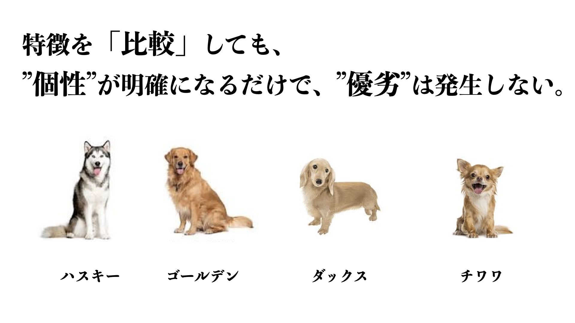 本日は、だーやまの“お気に入りの一節”をご紹介します! 第二章の1節です!簡単に説明をすると・・・ 「比較をやめよう!」なんてのは愚かな発想なんです。 「比較をする意味なんてない!」「他人との比較をやめよう!」 なんて語る方は、めちゃくちゃ多くおられます。 曰く、「他人と比較すると劣等感を覚える」「モチベや自己肯定感が下がる」 など・・・ゆえに比較をやめようと。 結論から言いますが、”比較”をしても優劣はつきません。 写真のように、犬を”比較”すると特徴があります。 特徴ごとに、「ハスキー、ゴールデン、ダックス、チワワ」と分けられたします。 ここに優劣ありました? ないんですよ。 ”比較”だけでは、優劣は発生しません。 優劣が発生する場合は、”条件”によってつくられるのです。 「力強さ」を条件に当てはめれば、ハスキーやゴールデンなど、身体が大きい犬が”優位”です。 「寿命」を条件に当てはめれば、ダックスやチワワなど、身体が小さい犬が”優位”です。 人も同じなんですよ。 何かにコンプレックスを感じたり、劣等感を覚えたりするのは、”比較”が問題ではありません。 「身長180センチ」と聞けば、印象的には良好な場合が多いでしょう。 それは無意識に”条件”を、当てはめているからです。 基本的には、高身長の方がイケメンと、文化的、社会的にされているからです。 しかし、「狭いところを通る」「隠れる」「逃げる」 といった場面では、「身長180センチ」は、劣等位になりやすいのです。 ”比較”は、他人との特徴を事実として、認識するためのものです。 特徴を細かく分けられるからこそ、”個性”が明確になるのです。 「比較の否定は個性の否定」 比較は悪でもなければ、罪でもありません。 ほんまちゃんと、”比較”してください。 劣等感で悩むなら、”条件”を外すことが大切なんですよ。 クラファンまだまだ挑戦中です!この内容も書籍で詳しく解説しています!是非、ご支援お願いします!