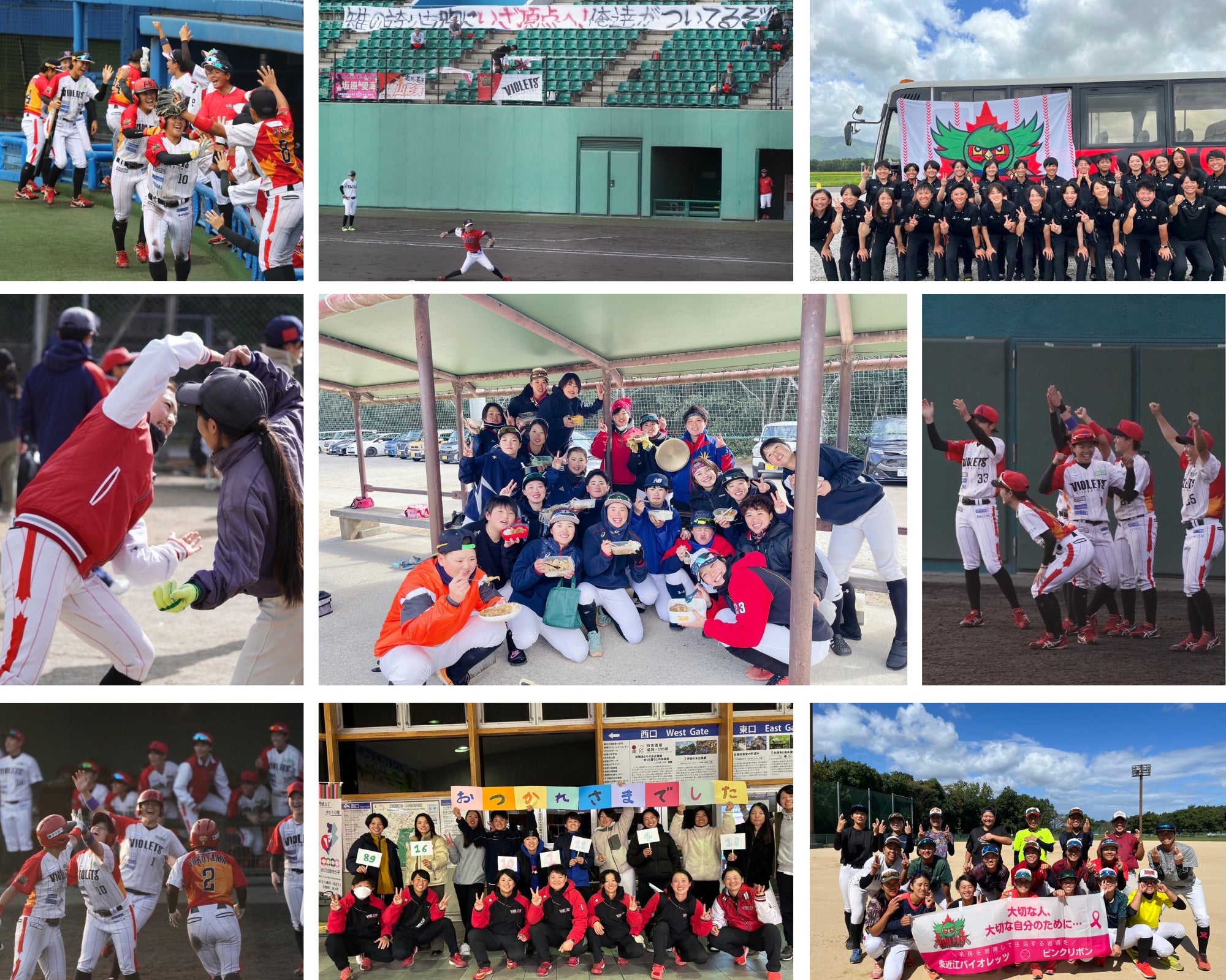 東近江バイオレッツは、野球と共に社会貢献活動・地域活動にも力をいれています。小学4年生を対象に体育の授業で野球の楽しさを知ってもらう『夢事業』や、ピンクリボン月間である10月にピンクリボングッズを身につけての乳がん啓発活動など、様々な活動を行っております。夢事業だけではなく、学童野球チーム対象の野球教室や幼稚園児対象のティーボール教室なども携わらせていただいているので、地域の子ども達との交流が非常に多いです。活動中は、私たちも一緒になって体を動かすことを楽しむことによって、子どもたちにも楽しい気持ちやできることが増える嬉しさが伝わることを実感しています。
