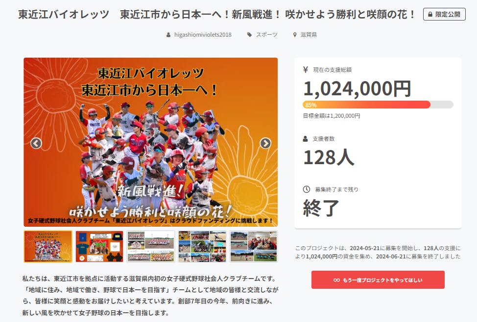 2024/06/23 16:36「東近江バイオレッツ 東近江市から日本一へ!新風戦進! 咲かせよう勝利と咲顔の花!」起案者の東近江バイオレッツ 主務の坂原朱音と申します。プロジェクトの募集期間が終了いたしました。皆様のご支援、ご協力により、128名の支援者様から、¥1,024,000のご支援を賜りました。※詳細はこちらからご覧いただけます。https://camp-fire.jp/projects/view/758470期間中、皆様からたくさんのあたたかなご支援と応援メッセージをいただき、また拡散にも快くご協力いただいたこと、心より感謝申し上げます。とても勇気づけられ、当チームがここまで毎日活動できている有難みを感じられる期間でした。たくさんの方々の支えがあって活動が続けられていることを忘れずに、残りの2024年シーズンを戦ってまいります。本プロジェクトはAll-in方式で実施しましたので、心を込めたリターンをお届けするとともに、ご支援金も今年8月開催予定のクラブ選手権の宿泊費に充てさせていただきますので、よろしくお願いいたします。これから順次リターンのご対応をさせていただきます。また法人様向けのリターンにつきましては、別途メールにてご連絡をさせていただきます。改めて、ご協力いただきまして誠にありがとうございました。higashiomiviolets@gmail.com東近江バイオレッツ 主務 坂原朱音バイオレッツ選手から御礼のメッセージ動画です。 もっと見る