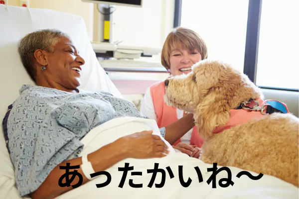 現在、実施されている病院や施設などでは、そのようなふれあいを通して、「緊張感の緩和」「不安やストレスの軽減」「闘病意欲の向上」などの効果が見られており、科学的にも裏付けられています。※認知症高齢者に対するイヌによる動物介在療法の有用性、ドッグセラピーによる認知症高齢者に対する生活意欲の向上とリハビリテーション効果の調査研究