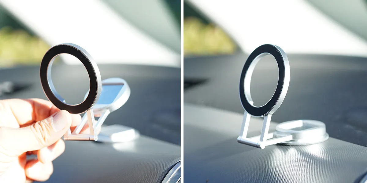 3M製の強粘着の土台マウントをダッシュボードへ貼り付けて固定することで、車載スタンドを磁力吸着でしっかりと固定することができます。(ダッシュボードの素材によっては粘着が貼り付きづらい場合があります。その場合は市販の吸盤向けシートを事前に貼って、土台マウントをご使用ください)