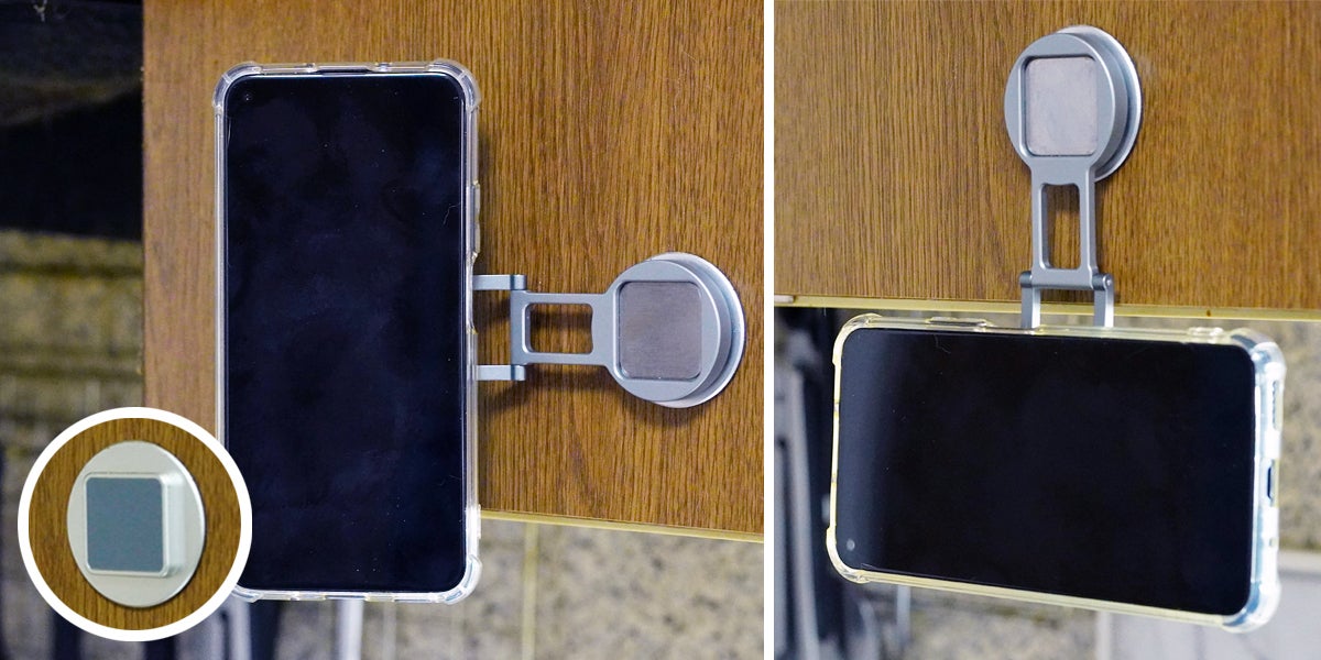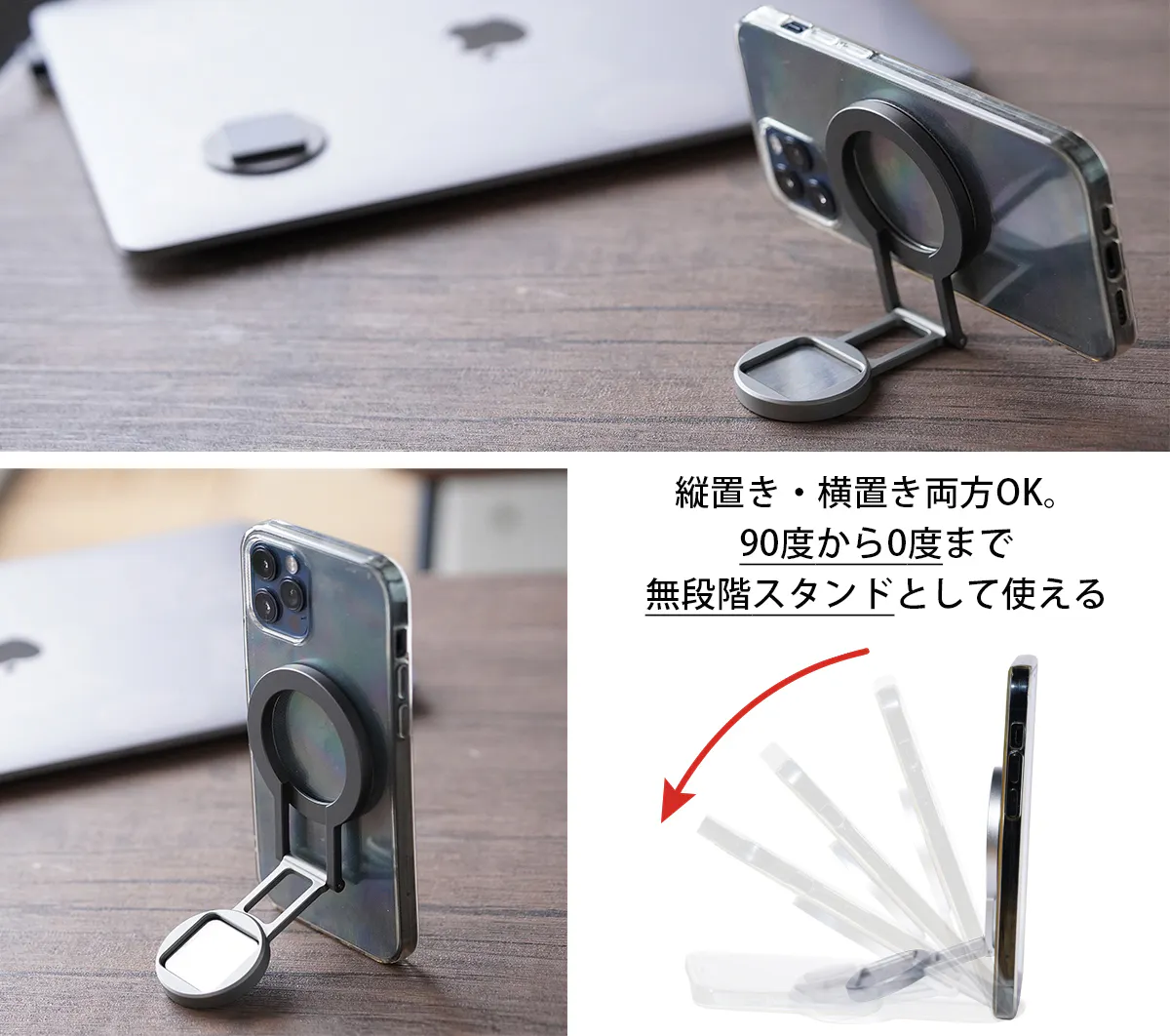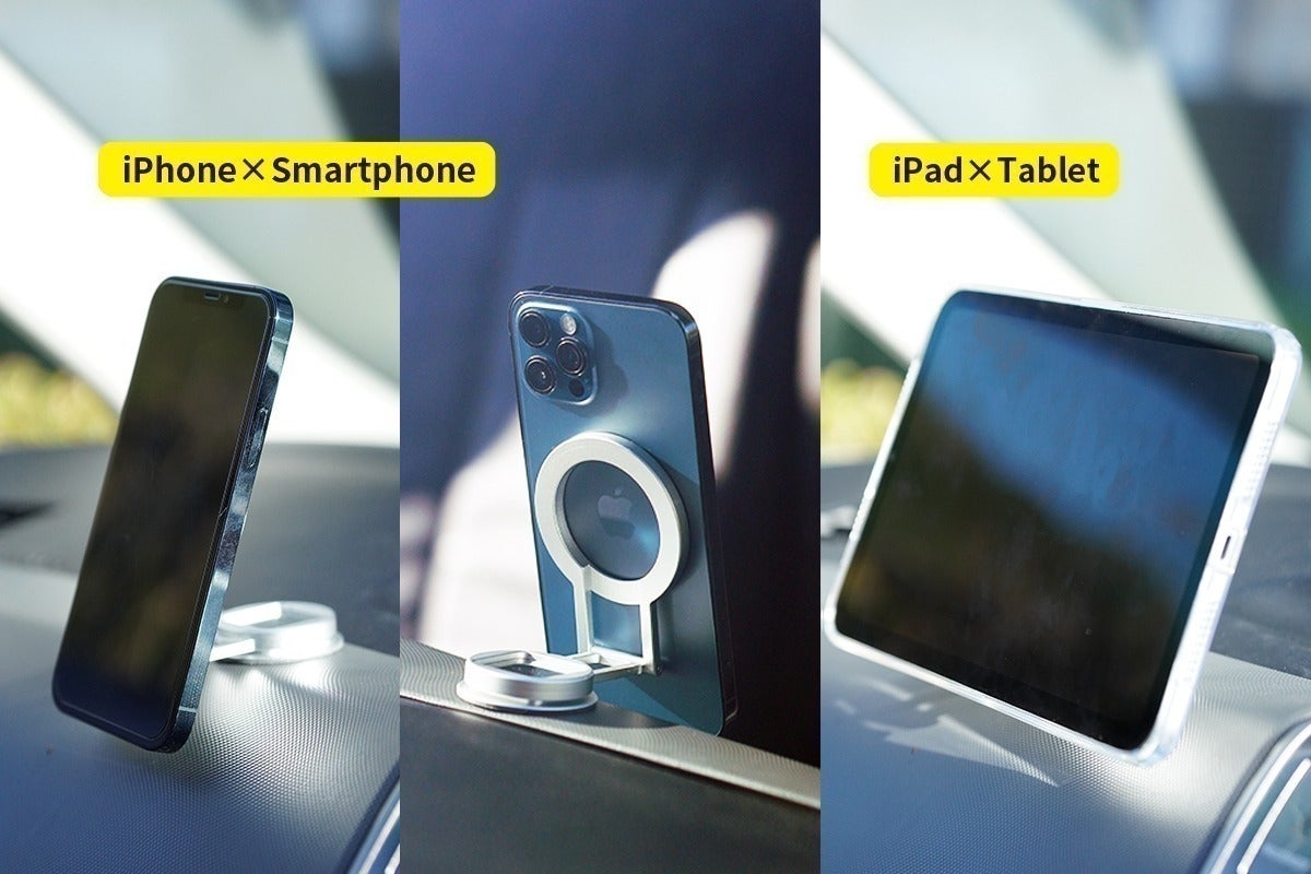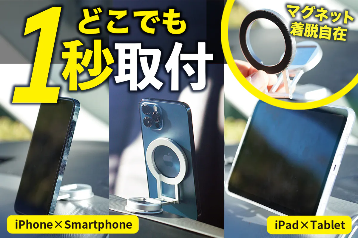 マグネット吸着に対応しているiPhoneやSmartphoneなら、そのまま「どこでも」マグネットスタンドに簡単取付が可能に。