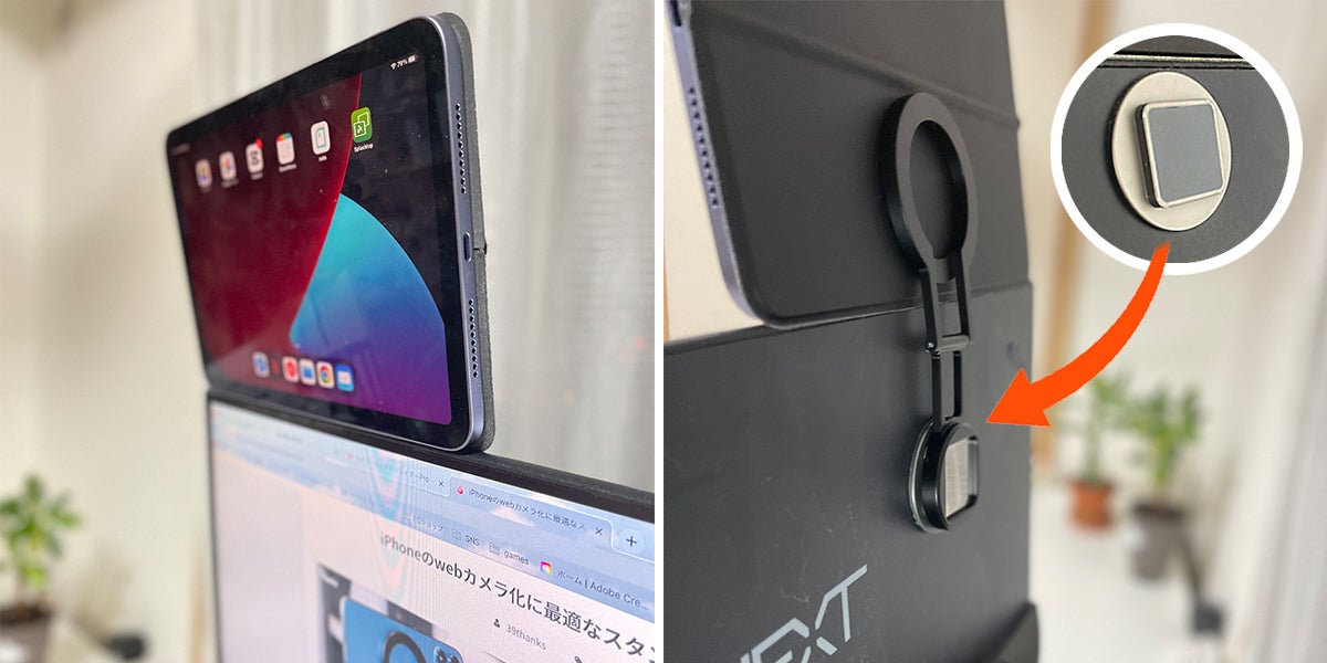 パソコンの外部ディスプレイに土台マウントを設置することで、iPad等のタブレットをディスプレイに連結もできる