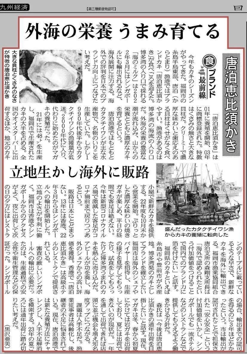 2012年より香港における唐泊恵比須かきの販路拡大を支援しており、現在ではマンダリンオリエンタルホテル香港の2つ星レストランAMBERを含む20店舗以上のレストランで採用され、23年からはシンガポールにも輸出されています。昨年は、福岡市にオープンしたリッツカールトン福岡の最上階に位置するバーBAYでも提供が始まりました。