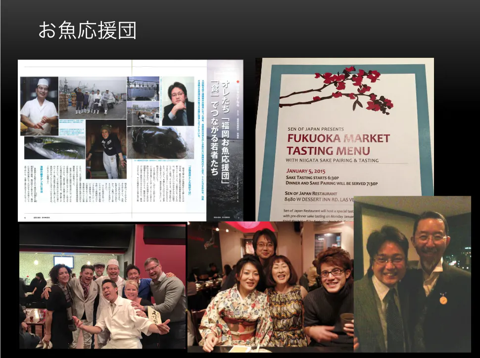 2011年からは、海外での活動を開始し、現在までに、東京、ニューヨーク、バルセロナ、ピエモンテ、ラスベガス、香港、パタヤなどで福岡の魚介類の販路拡大イベントを開催してきました。