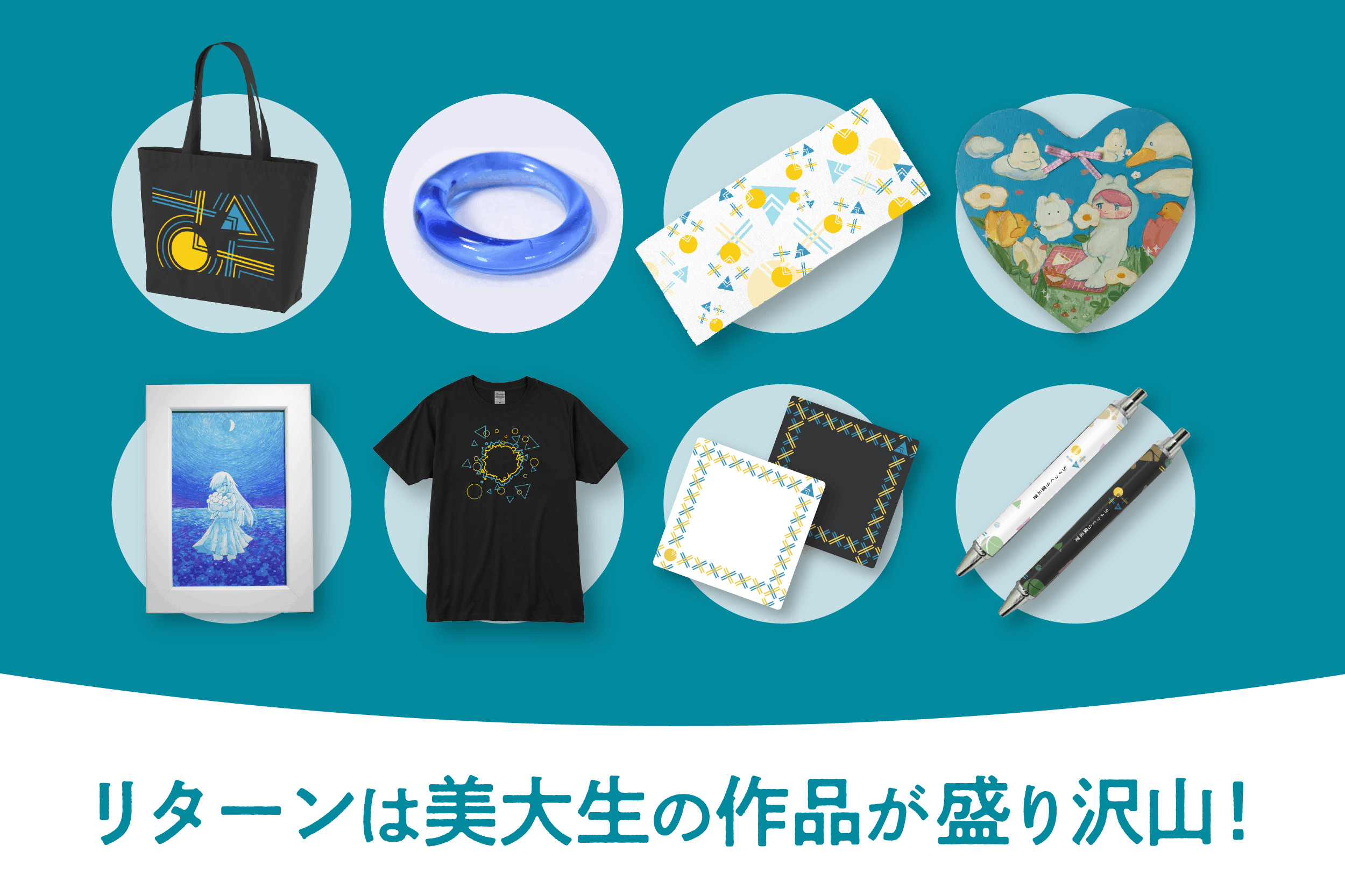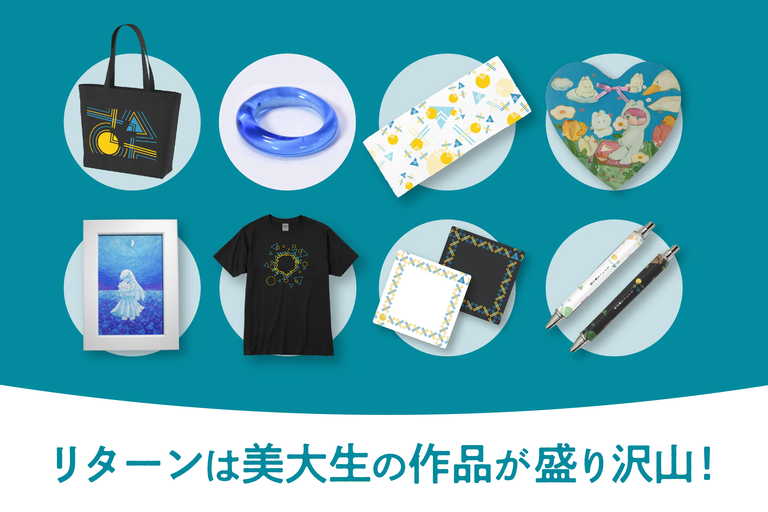 本プロジェクトでは、美大の在学生・卒業生が心を込めて制作した一点物の作品を、皆様のリターン品としてご用意しました。学生たちは、日々の創作活動を通して培ってきた技術と情熱を注ぎ、世界に一つだけの作品を生み出しました。それぞれの作品には、個性豊かな表現とストーリーが込められており、普段手にいれることができない作品ばかりなので、是非この機会に触れてください!