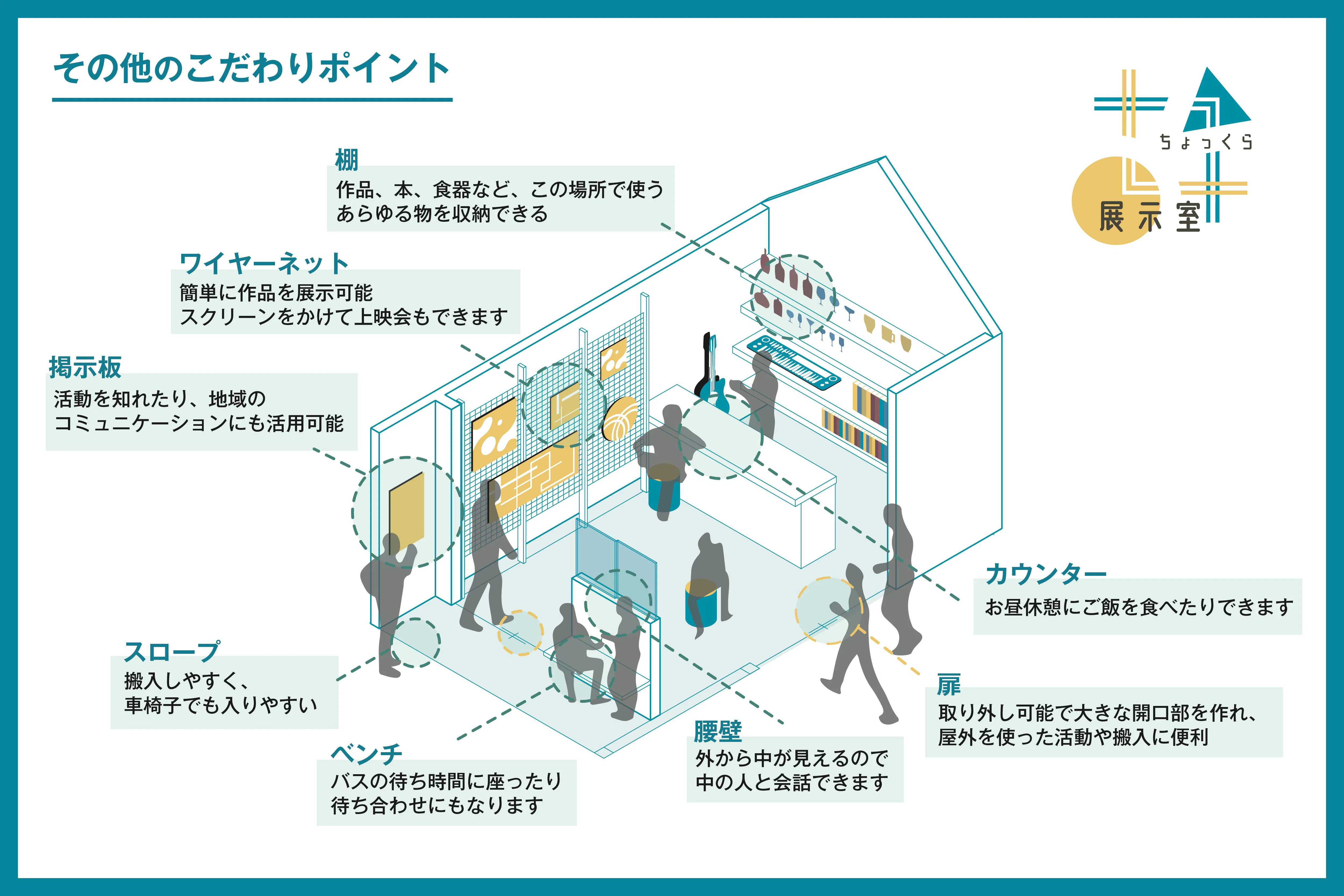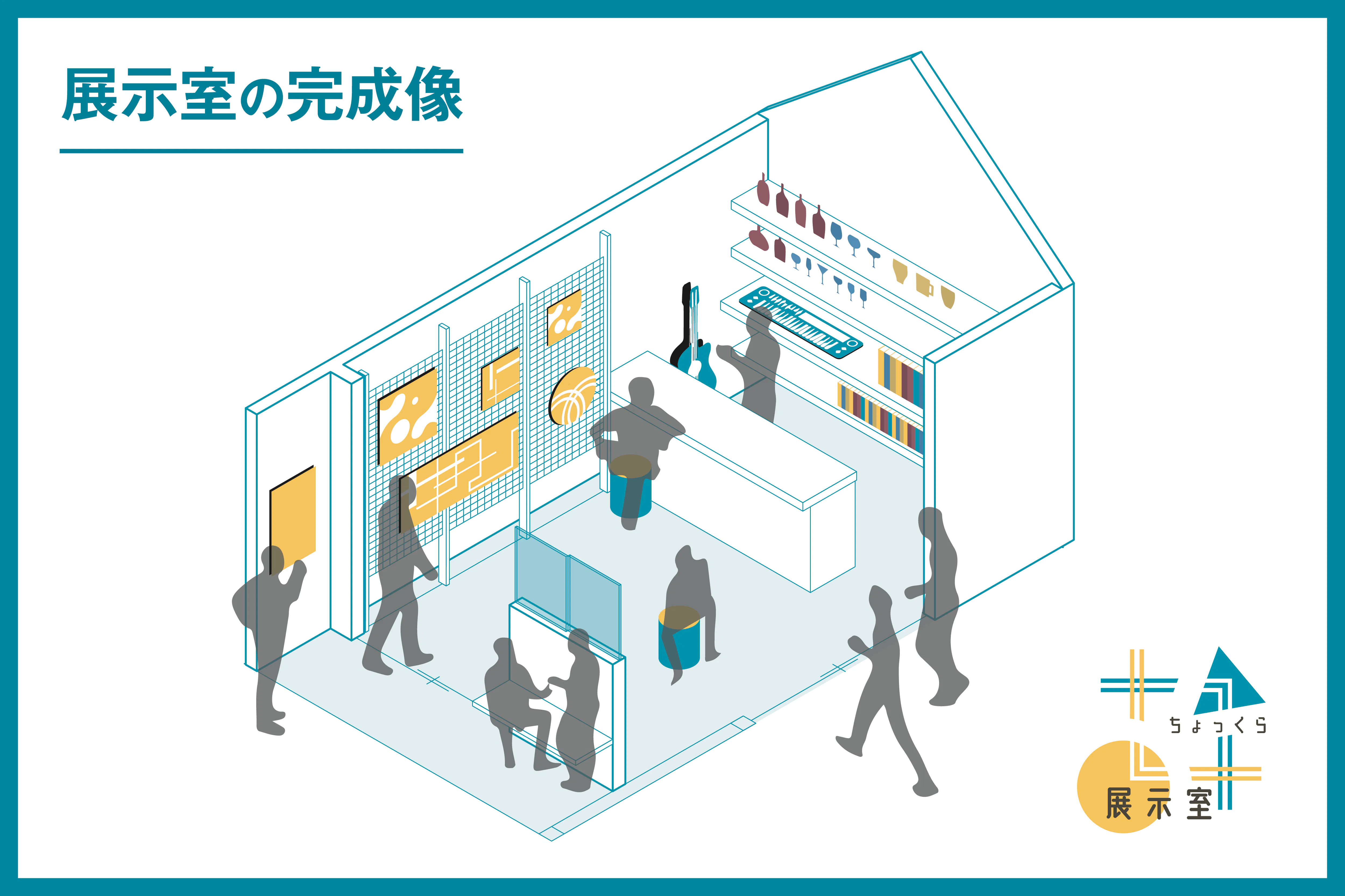 この展示室は、誰でも気軽に入っても良い・展示しても良い、そんなちょっくら寄れる「安心感」のある展示室目指しています。美大生の作品・イベントを中心に、地域の人との交流が生まれる、滞在できる空間にしていきます。