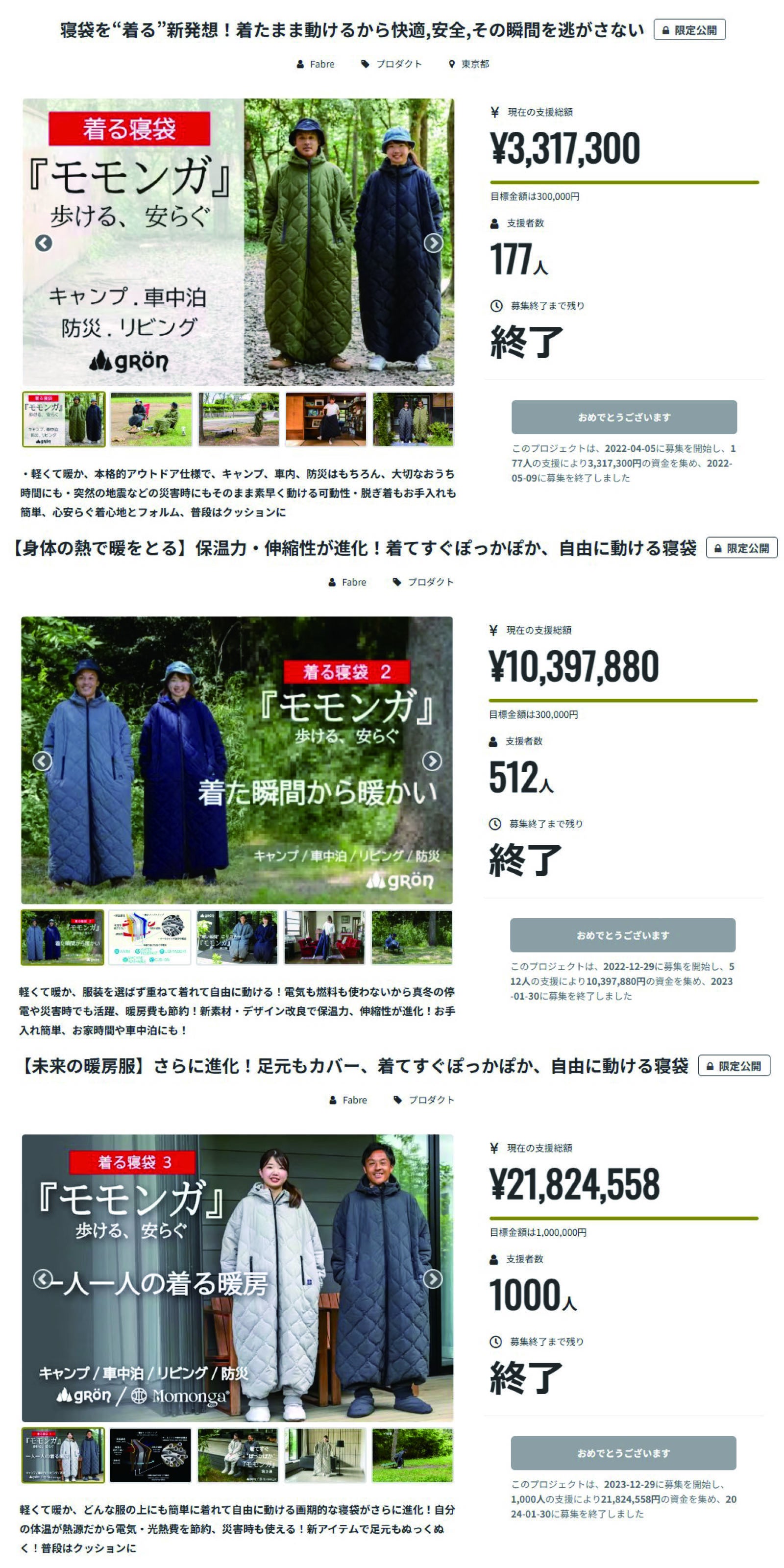 第1弾「モモンガ」では支援者数177人、達成率1105%、第2弾「モモンガ2」では支援者数512人、達成率3465%、第3弾「モモンガ3」では支援者数1000人、達成率2182%と多くの反響をいただくことができました。本当にありがとうございました。