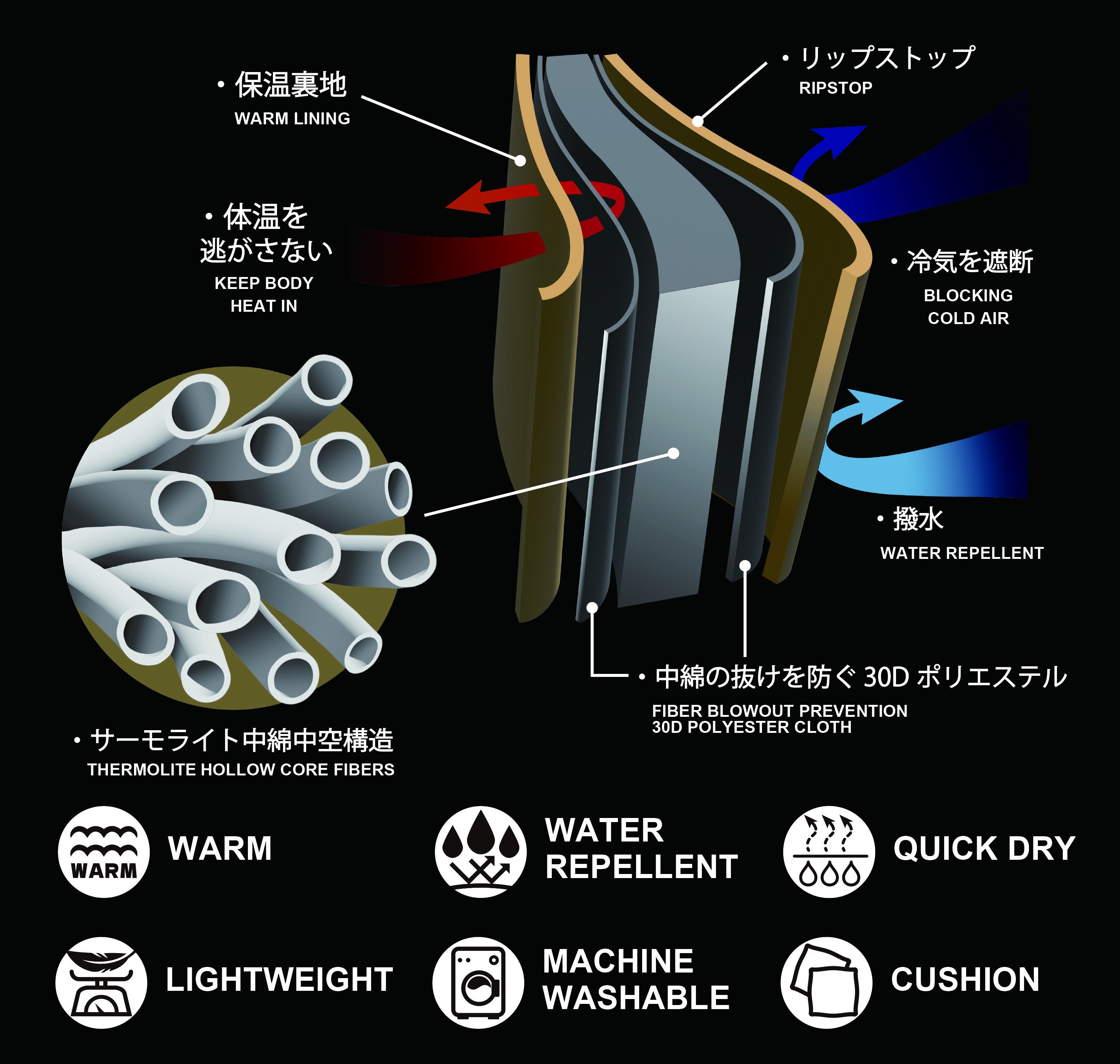 優れた保温性を持つインビスタ社のサーモライト中綿は、機能性が求められるスポーツ・アウトドア分野で数多くのアウターや寝袋を中心に使用されてきました。独自の繊維構造により暖かく快適さを提供する軽量保温素材です。