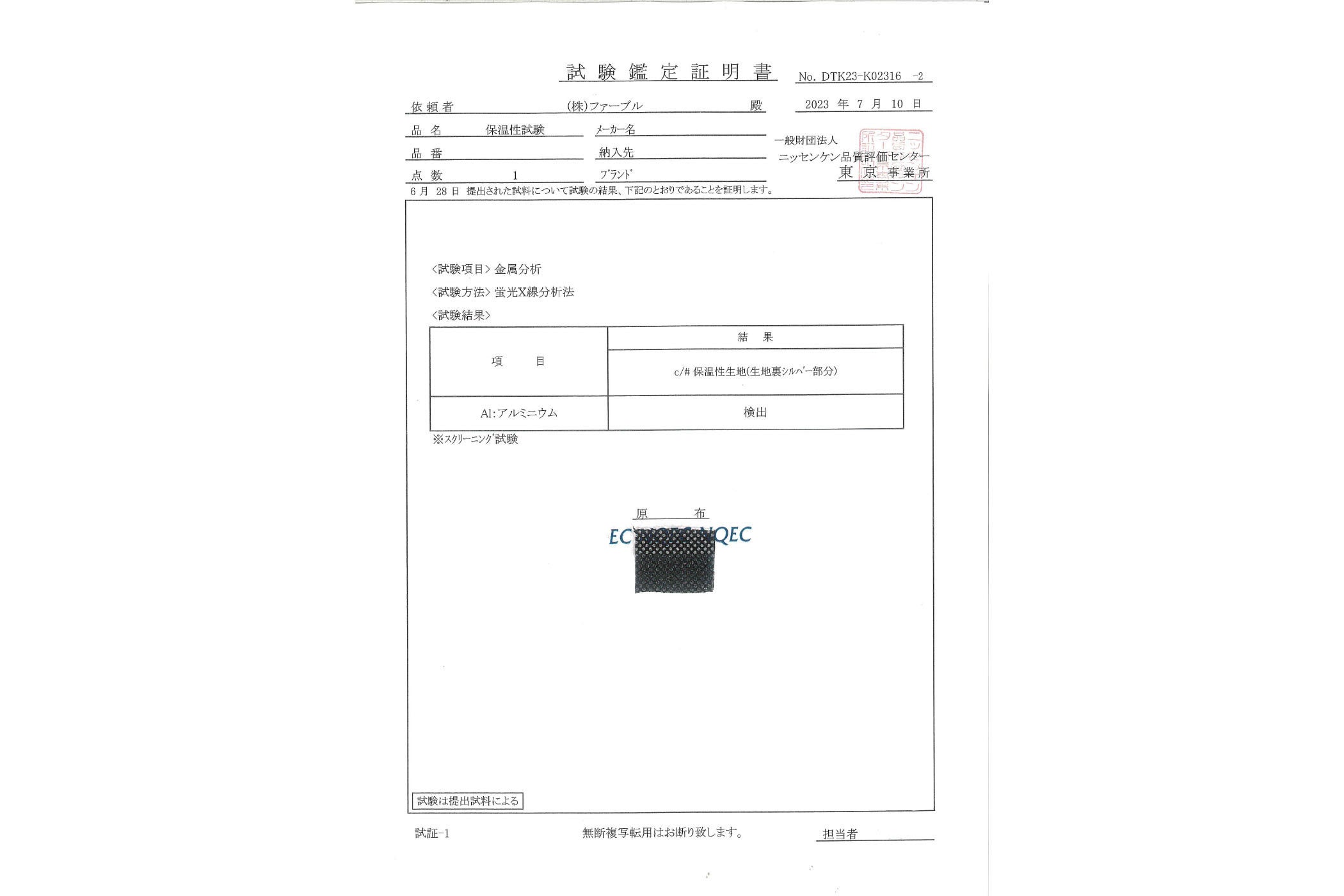 JIS L 1096 A法(恒温法)の保温性検査で弊社比較品より約124%保温性の向上が確認されました。