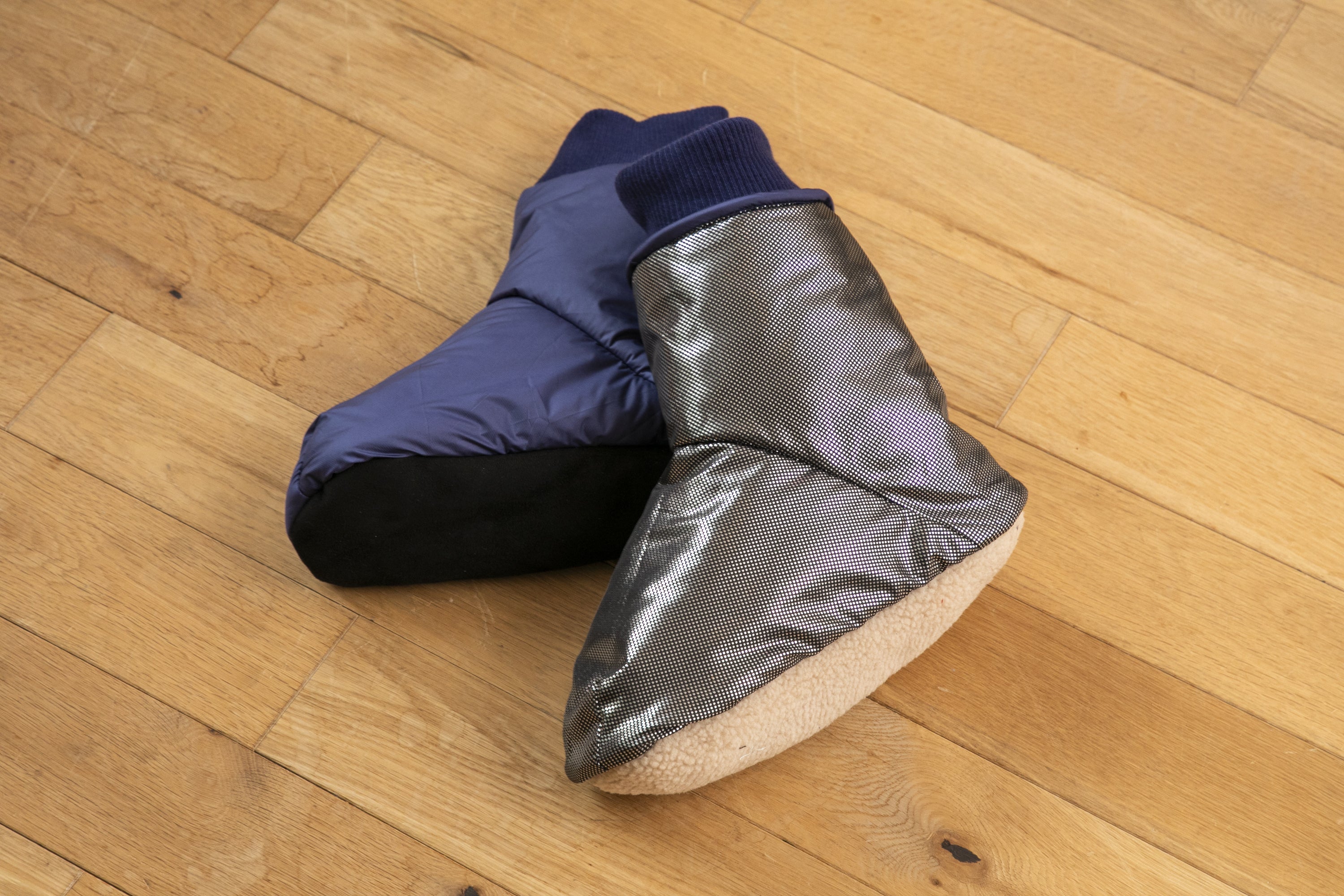「ルームソックスシューズ」を作りました。アウトドアではテントの中で履くテントシューズが一般的ですが、もっと楽に履けるよう靴下風のデザインにしました。中綿には厚手のサーモライト中綿を使用し、裏地は保温裏地を使っています。内底はボアで暖かく、外底はポリエステルスウェードで滑りにくくなっています。とてもとても暖かいです。(外履き用ではありません。テント内や室内でご使用ください。)