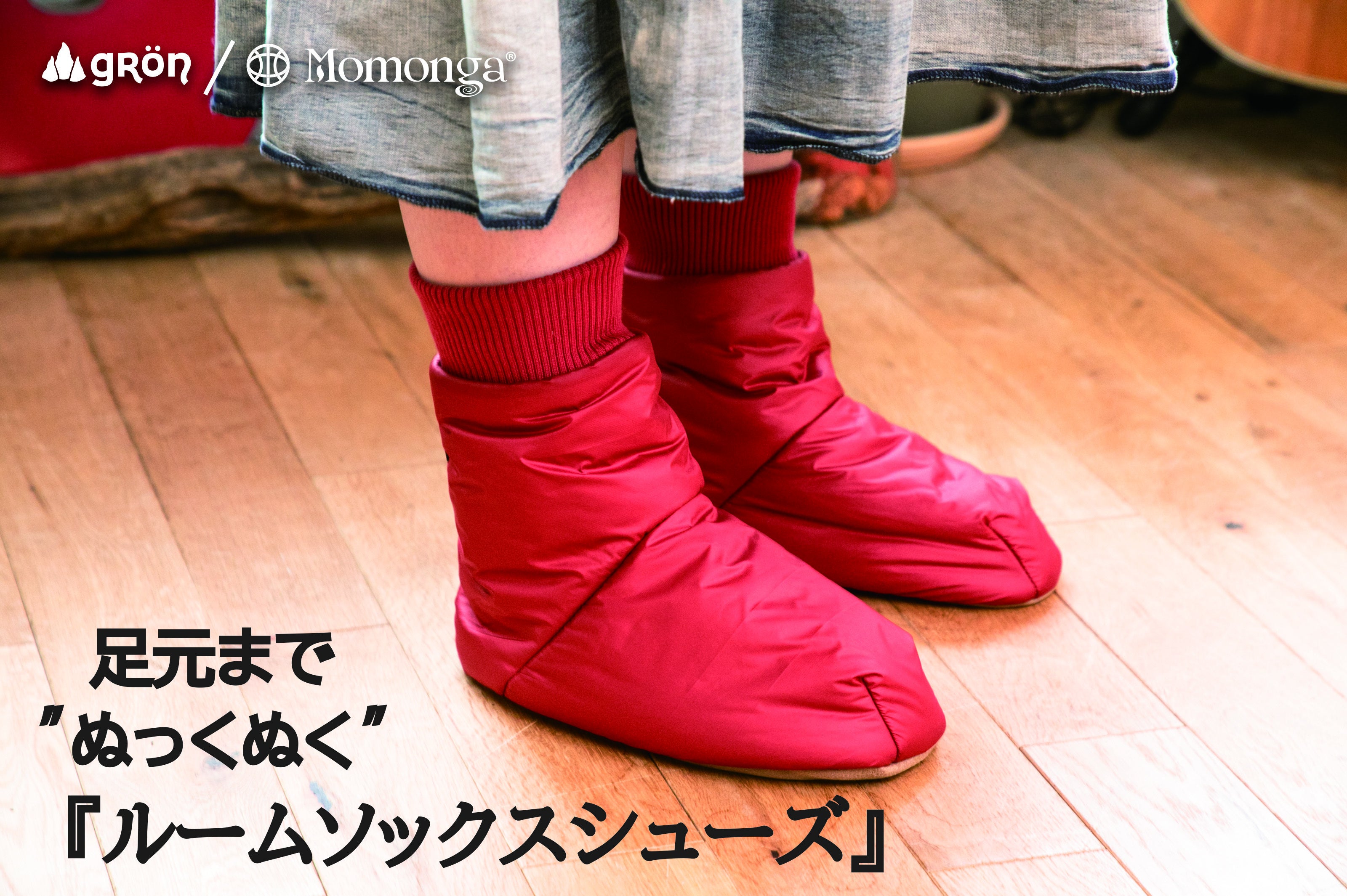 モモンガトラベラー本体と同じアルミニウム蒸着の保温裏地を使っています。内底にはボアを使っているので履いた瞬間から暖かく、外底はポリエステルスウェードで滑りにくくなっています。