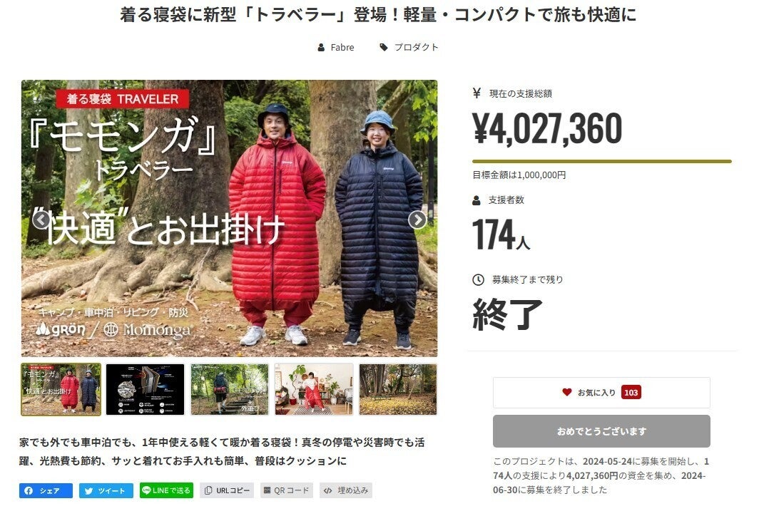 2024/07/01 19:00この度は【着る寝袋に新型「トラベラー」登場!軽量・コンパクトで旅も快適に】プロジェクトにたくさんのご支援をいただき誠にありがとうございます。【 応援購入総額 : 4,027,360円 】【 サポーター人数 : 174人 】みなさまからのたくさんのご支持をいただき、無事に終了させていただくことができました。今回の『トラベラー』タイプにつきましてはこれまでのモモンガシリーズをご購入いただた方々からの貴重なご意見を参考にさせていただき、持ち運びにも対応できるような仕様に特化させていただきました。これからもモモンガシリーズでは進化を続けていきたいと考えておりますので、今回のモモンガをご使用いただきましたら、ぜひ感じたことのご意見をいただけますと今後の商品開発の参考・励みになりますので、幸いです。リターン品のお届け予定は[ 2024年 9月下旬 ]となっておりますので、生産状況なども含めて近くなりましたら改めてご報告させていただきたいと思います。*本製品は『受注生産』となっておりまして、本日工場への生産の手配を進めてまいります。その為、本日以降の「カラー・サイズ」変更につきましては原則としてご対応できかねますのでご了承ください。 もっと見る
