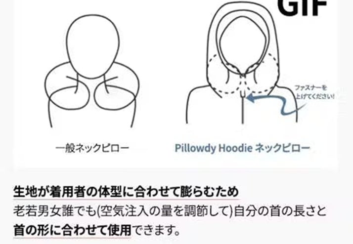 Pillowdy:プラスチック 充填物を使わないAirネックピローを活用した洋服。いつでもどこでも快適な睡眠をお約束します。