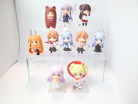 ねんどろいど等の小さいフィギュア用のアクリルひな壇は既に製作済です。こちらは3000円+送料になります。