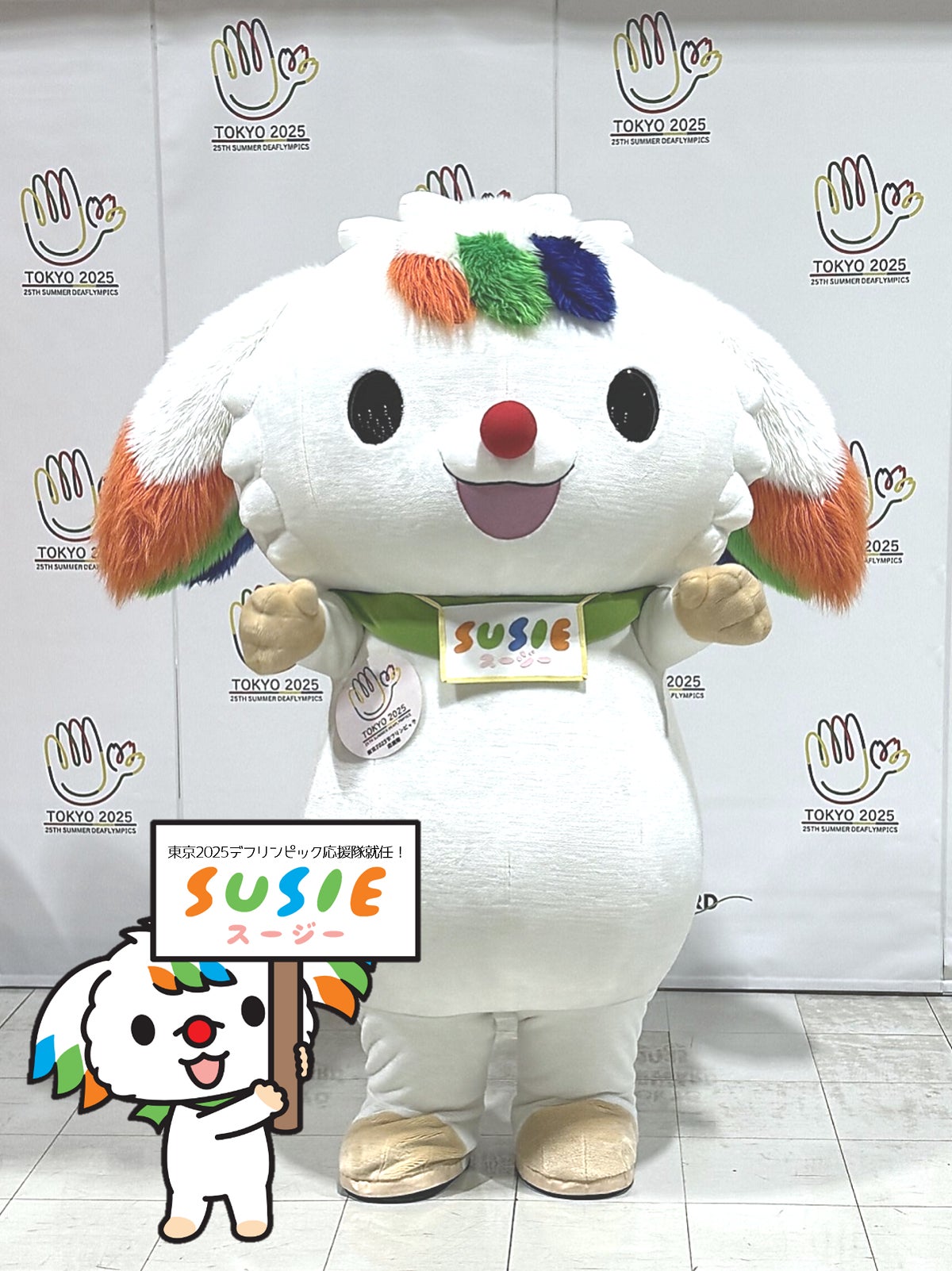 当事業団のキャラクター「SUSIE(スージー)」をはじめ、みなさまと一緒にデフリンピックを盛り上げたい!という想いを持った「ふじっぴー」やデフリンピックを手話で応援したいと密かに練習している「ベコ太郎」など個性豊かなキャラクター達と一緒に大会を盛り上げていきましょう。