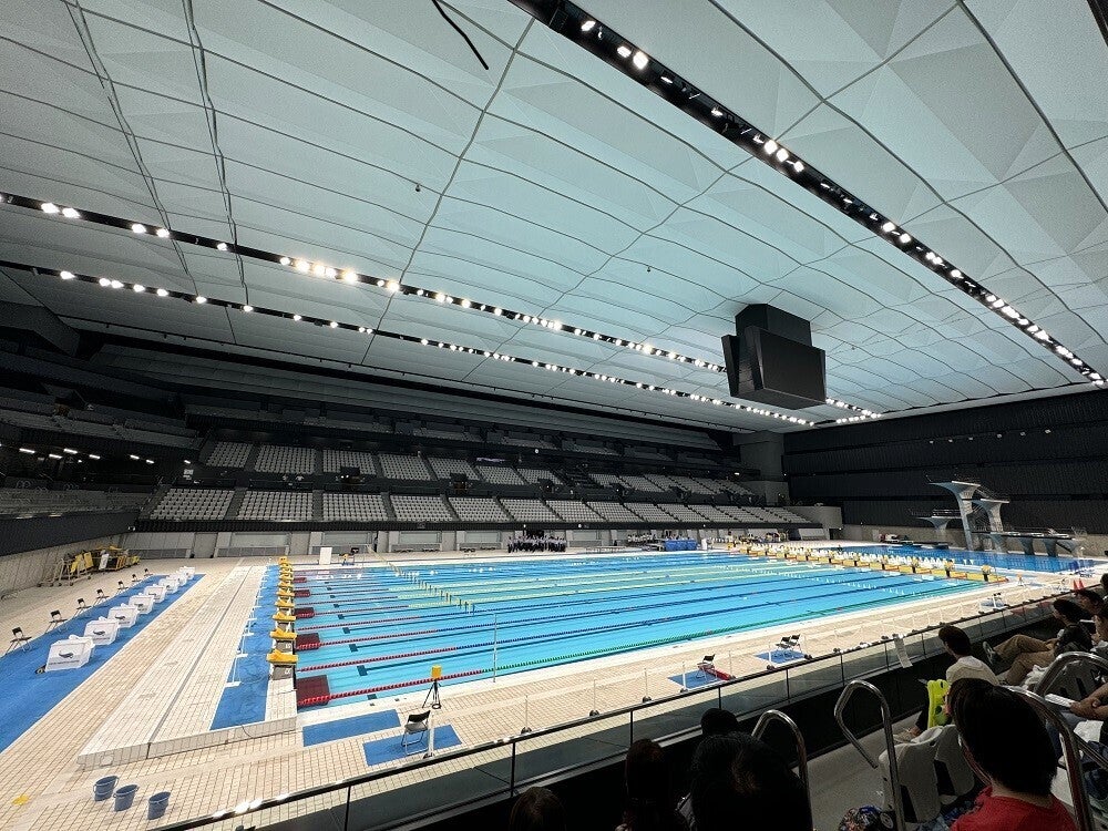 東京アクアティクスセンターの外観(画像1枚目)の柱は竹林、プール(画像2枚目)の天井は折り紙をモチーフにデザインされ、日本らしさが表現されています。