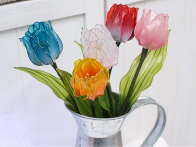 ディップアートとは、「アメリカンフラワー」とも呼ばれ、ワイヤーで花びらや葉などの形をつくり、ディップ液(樹脂液)を浸すことでガラスのような透明感と輝きを持つ美しいアート作品のことです。