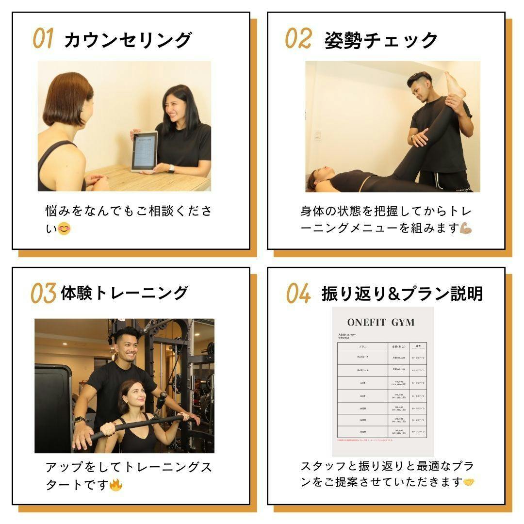 一般的なパーソナルジムだと目的に対してのトレーニングメニューがマニュアル化されていることがほとんどですが、ONEFIT GYM(ワンフィット ジム)はあえてマニュアル化をしていません。理由は人それぞれ骨格に違いがあり、筋肉のつき方にも違いがあります。当店では体験トレーニングの時にしっかりとカウンセリングと骨格チェックを行います。しっかりと骨格チェックや筋肉の付き方を確認することでそのお客様の目的・目標に対して無駄なく効率的なトレーニングメニューをご提案することができます!