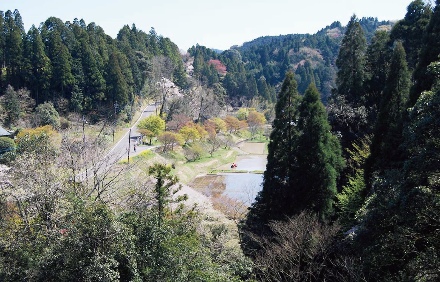 (千葉県市原市朝生原の房渕という地域。水を張った田んぼの左横に見える屋根が、今回の宿になる物件)