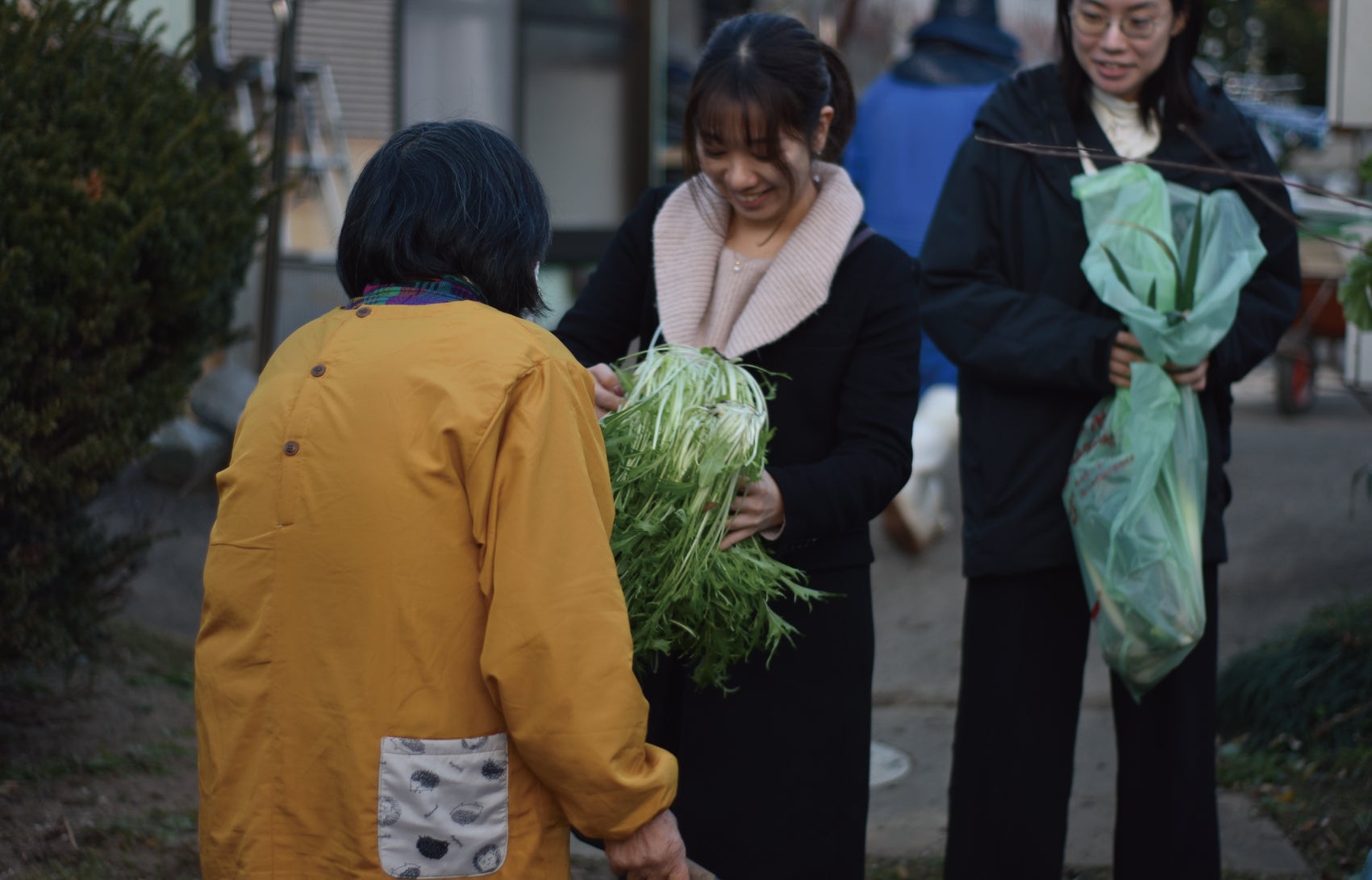 (11月におこなったモニターの様子。大きな白菜をくれるおばあちゃん。1個でいいって言ったのに、、)