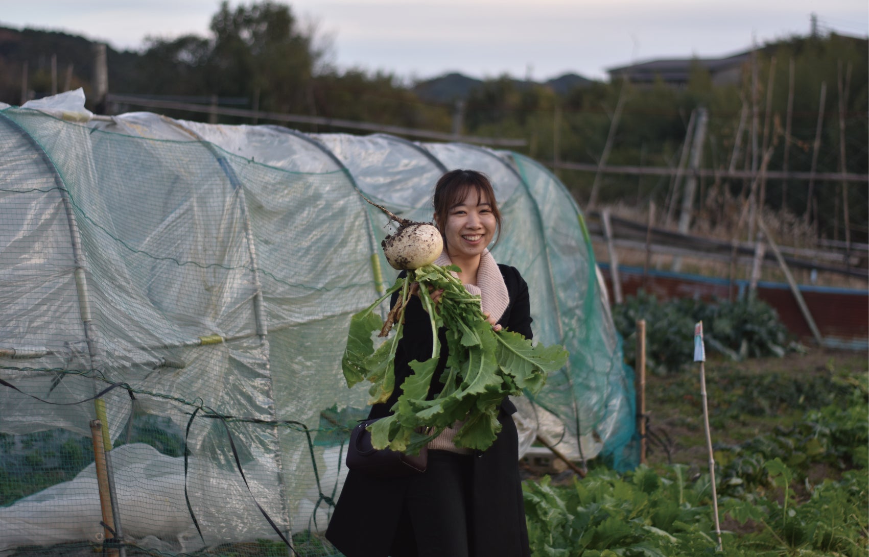 (トライアルツアーの時の様子。鍋をすると言ったらくれた水菜。予定ではネギと大根だけだったのに、、)