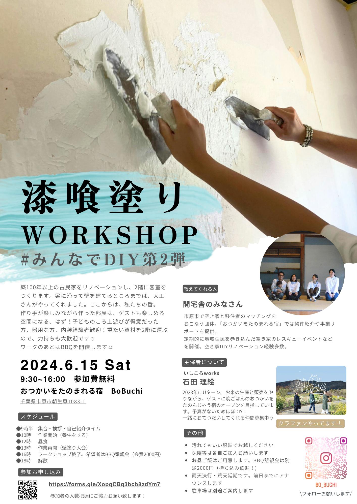 2024/06/04 09:15こんにちは!来週の土曜日にみんなでDIY企画の第2弾、漆喰塗りワークショップを開催します☺客室となる2階部分の壁に、みんなで漆喰を塗っていきます。私自身もはじめてなので、どんな風に仕上がるかドキドキです...!ご興味のある方は是非ご連絡ください。ワークショップのようすはまたこちらでご報告させて頂きます☺引き続き宜しくお願いします! もっと見る