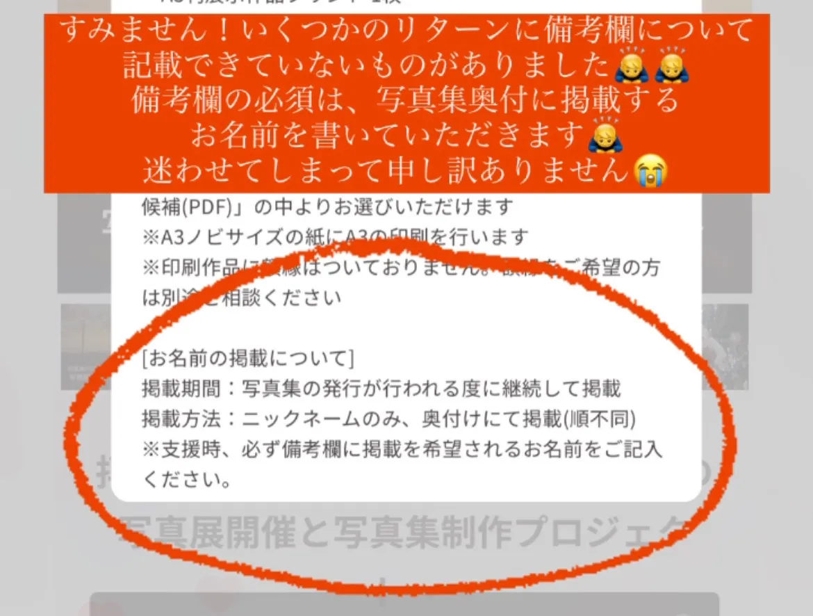 今回ご支援くださった皆様のお名前を、写真集の奥付けページに掲載いたします。それにあたり、掲載するお名前(ニックネーム)を備考欄に記入してください。