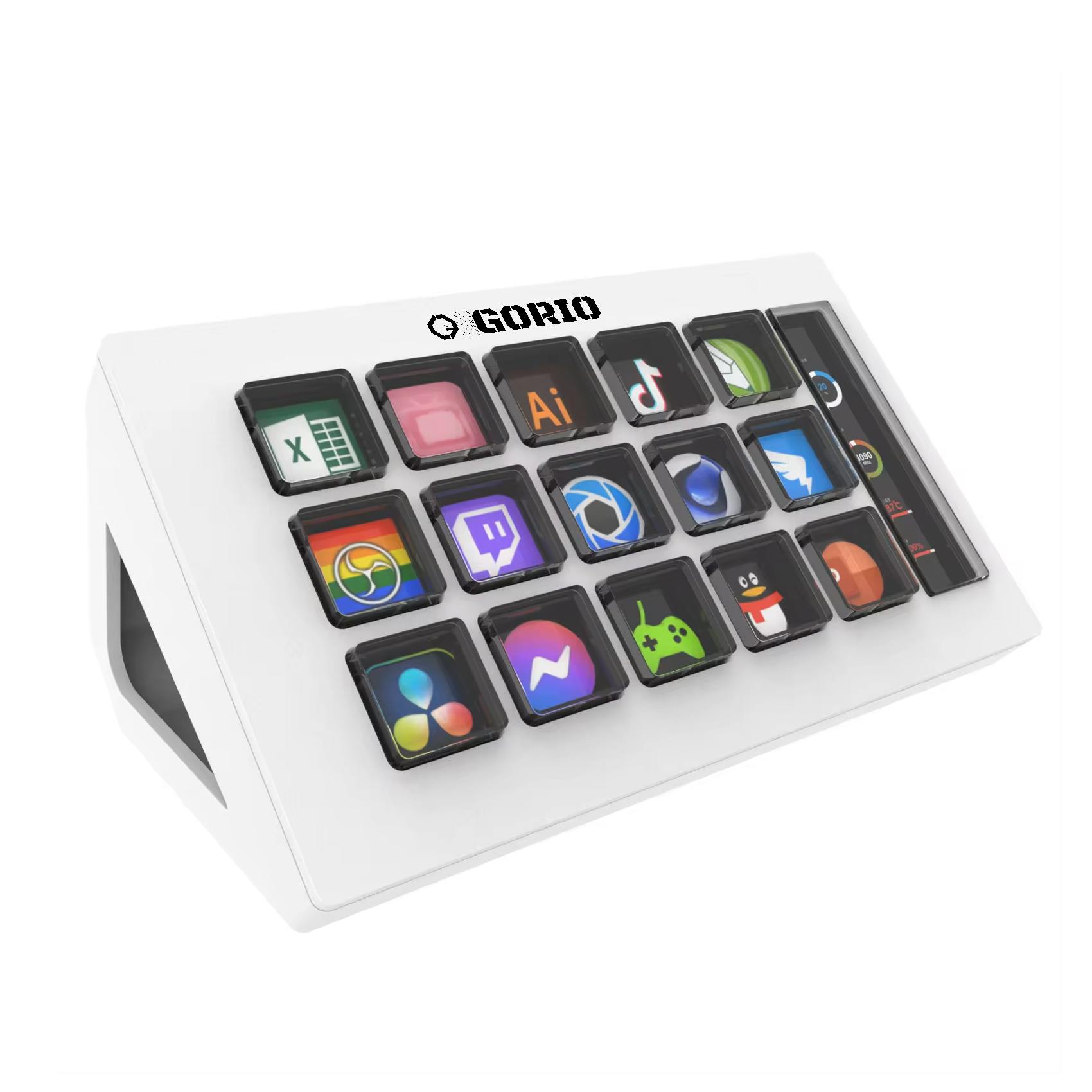 **プログラム可能な15個のスイッチ**15個のプログラム可能なスイッチは、シーンの切り替え、メディアの起動、オーディオの調整など、さまざまな操作をワンタッチで実行できます。また、GIF、画像、ビデオ、オーディオクリップ、イントロとアウトロのグラフィックを使って、ボタンを完全にカスタマイズすることも可能です。
