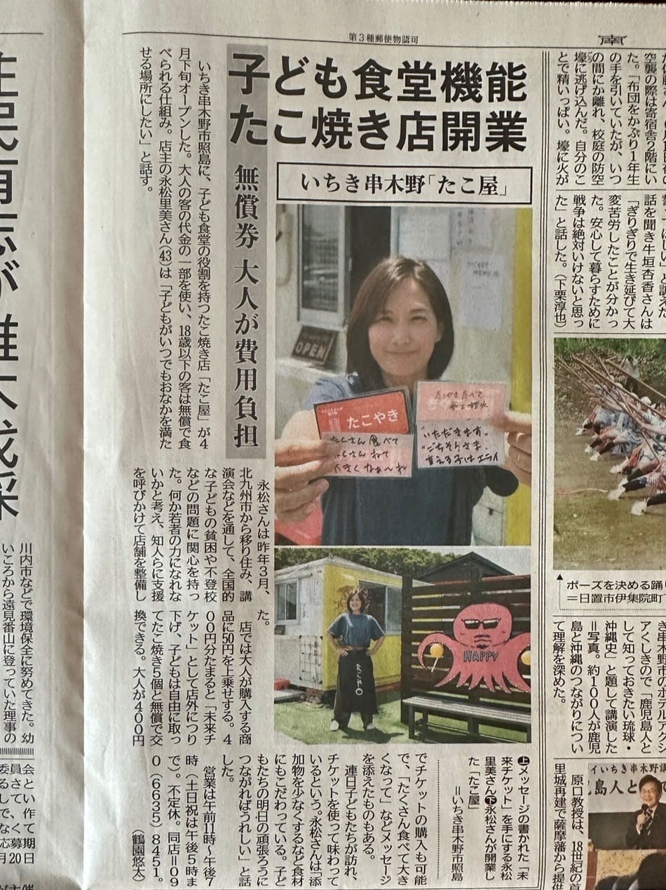 2024/05/16 10:32なんと、南日本新聞に掲載されました!子供達も沢山きてくれて毎日賑わってます!店舗の方でのチケット購入も少しずつ増えており助かってます。しかしチケットの方が先に無くなり来る子供達全員が食べれない状況には変わりありません。支援の方よろしくお願いします。 もっと見る