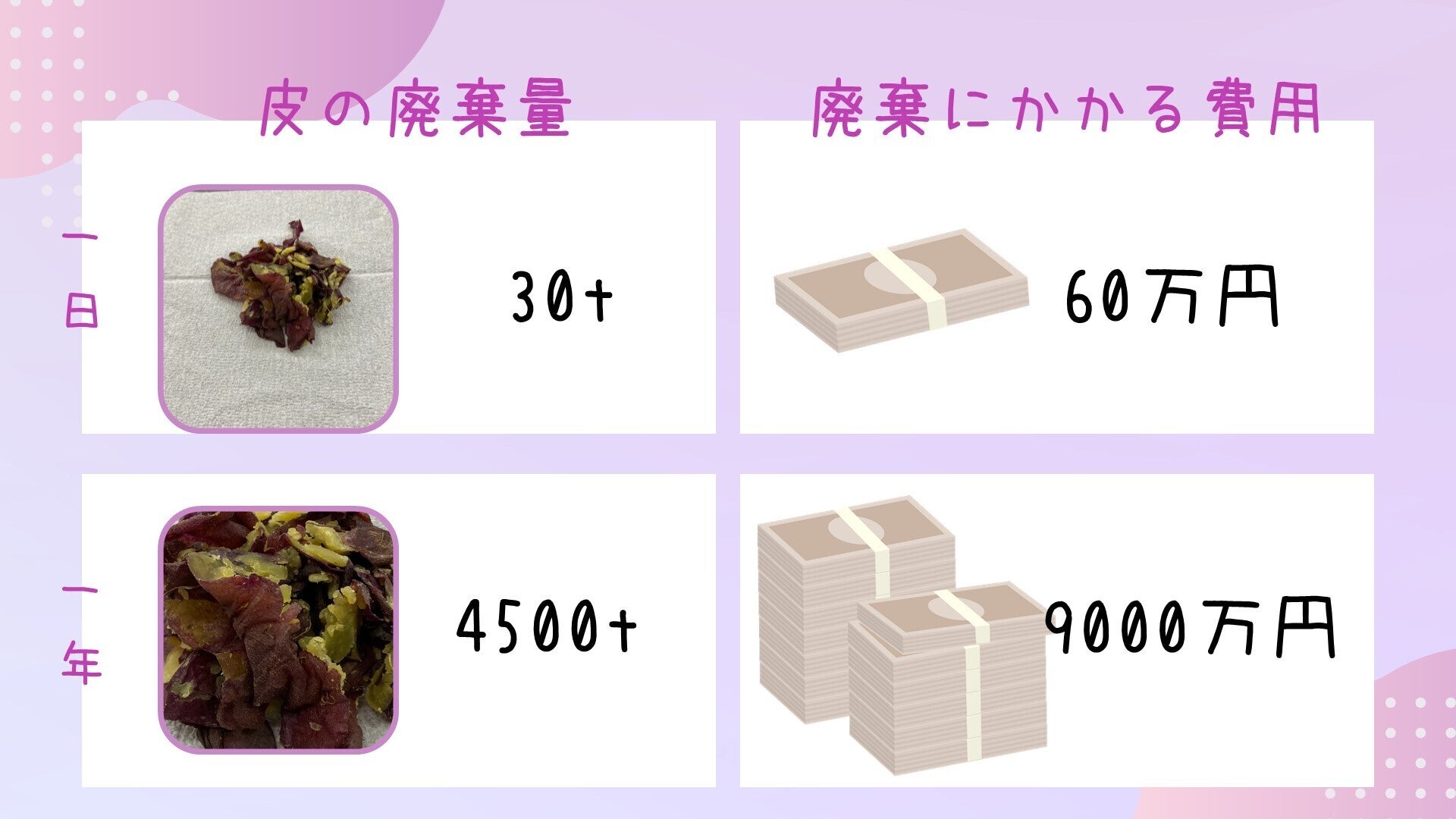 干し芋屋は、年間120日程しか稼働していなところも多くあります。それを踏まえて考えたとしても、年間9000万円が廃棄費用としてかかってきているのです。干し芋屋さん一軒だけでこの金額です。ひたちなか市だけでも50軒以上の干し芋屋さんがありますから、総額は何十億になることでしょう。