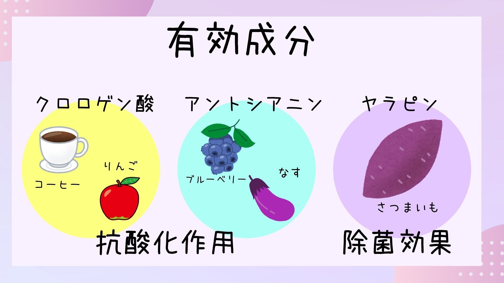 クロロゲン酸とアントシアニンには抗酸化作用(アンチエイジング効果)があり、ヤラピンには除菌効果があります。