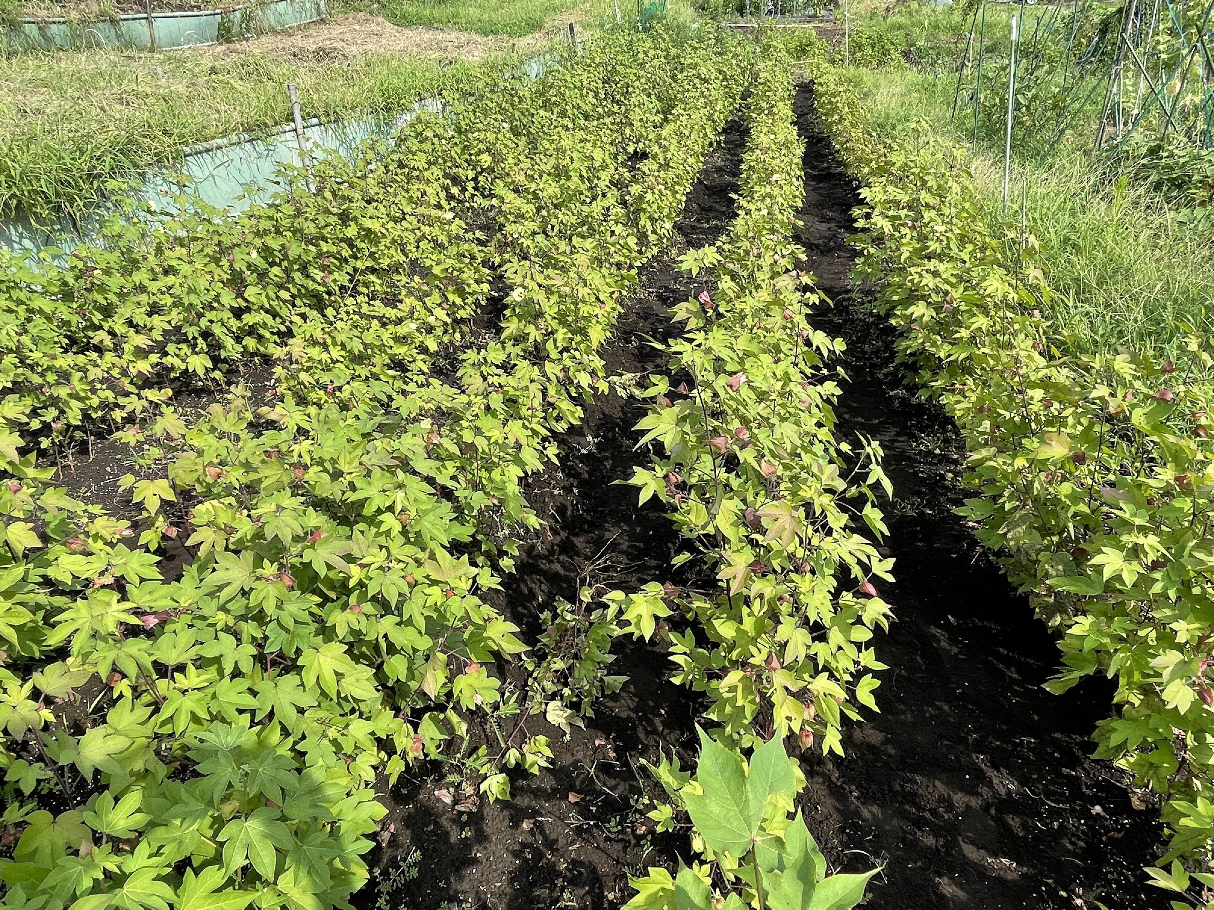 2024/05/24 06:08皆さま、こんにちは〜!〜三芳村の和綿畑の芽が出ました〜!5月10日のコットンデーに蒔いた和綿が、1週間後の17日にしっかり芽を出しました。和綿は約400㎡(4畝程度)ほどの作付けですが、今年は、こまめに草対策をして収穫量を上げていきたいと思います。今後も草取りや間引き、摘芯など栽培状況を報告していきます。秋の収穫が楽しみです! もっと見る