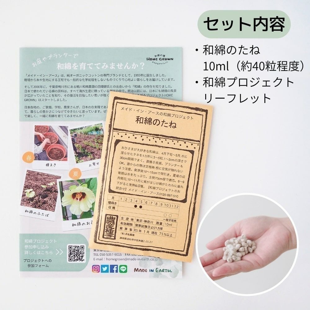 人間が唯一生きるために大切としている「衣」を小さな和綿の種を通じて考え、メイド・イン・アースと共に和綿のたね ひろがるプロジェクトの活動に賛同いただけると嬉しいです。
