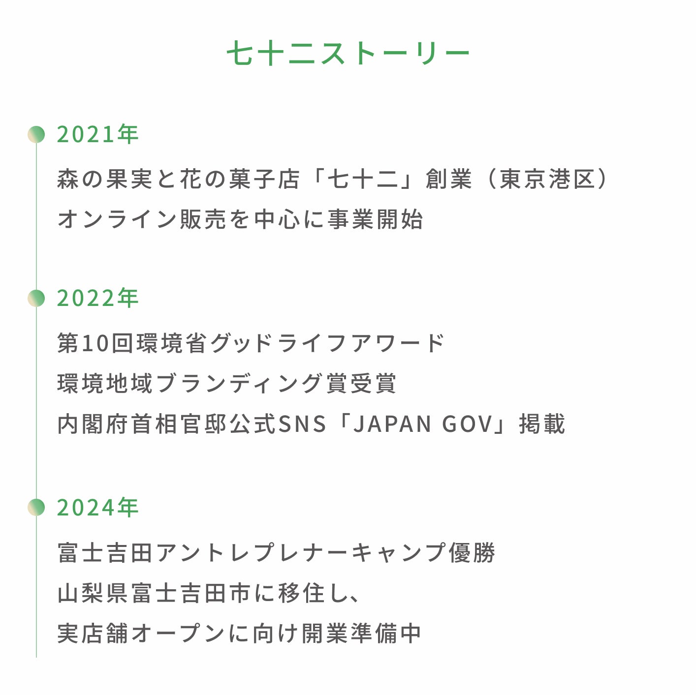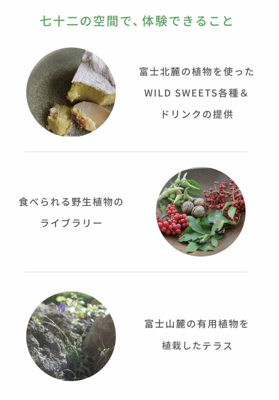 日本の森に自生する野生植物を食材として使った、新感覚の”食べる森林浴”を提供するスイーツ「WILD SWEETS」を創作。都内に厨房を構えオンライン限定販売をしていたが、山梨県富士吉田市に移住し、七十二の実店舗の立ち上げを決意。