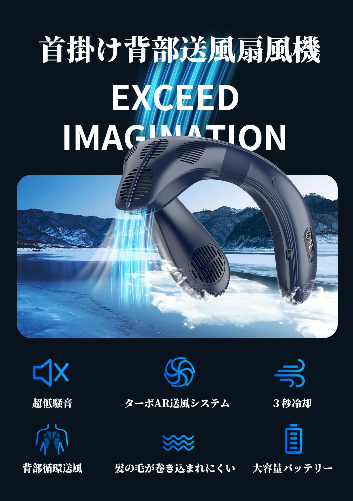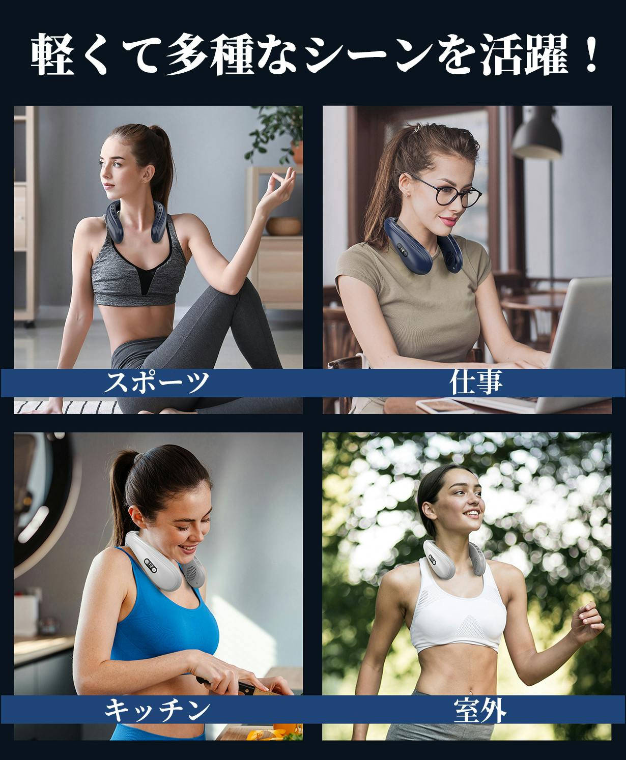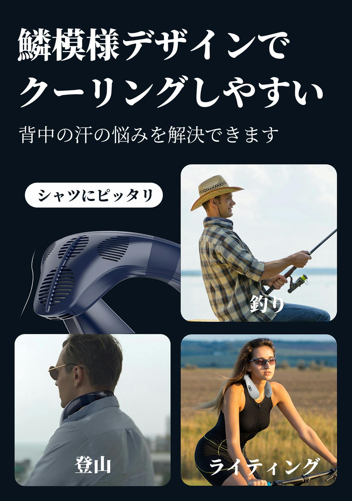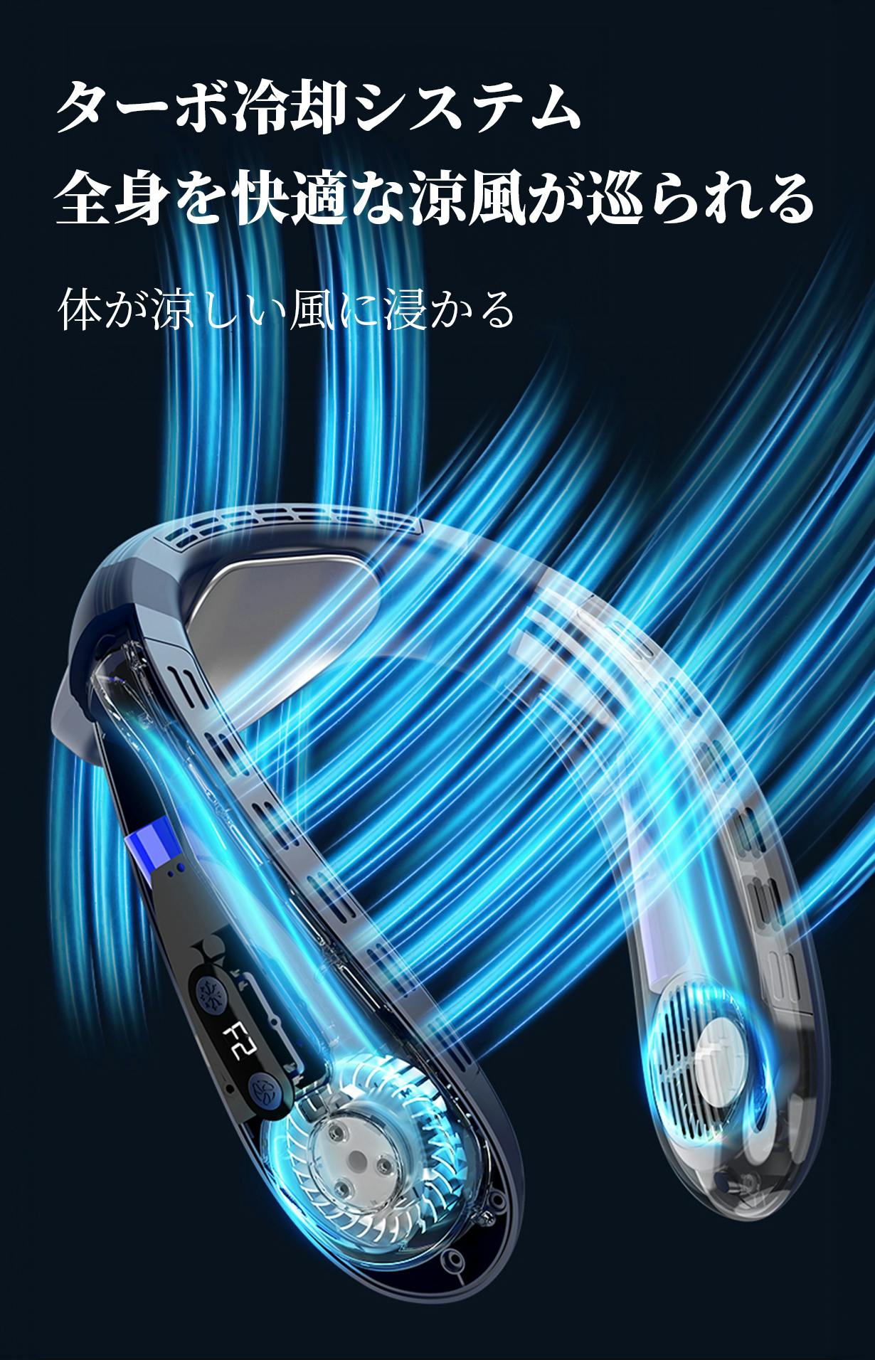従来型の首掛け扇風機なら、送風は首周囲に集中しています。本製品なら背部と両側に風を上下循環され、涼しい風を全身に巡り、どでも心地よい!