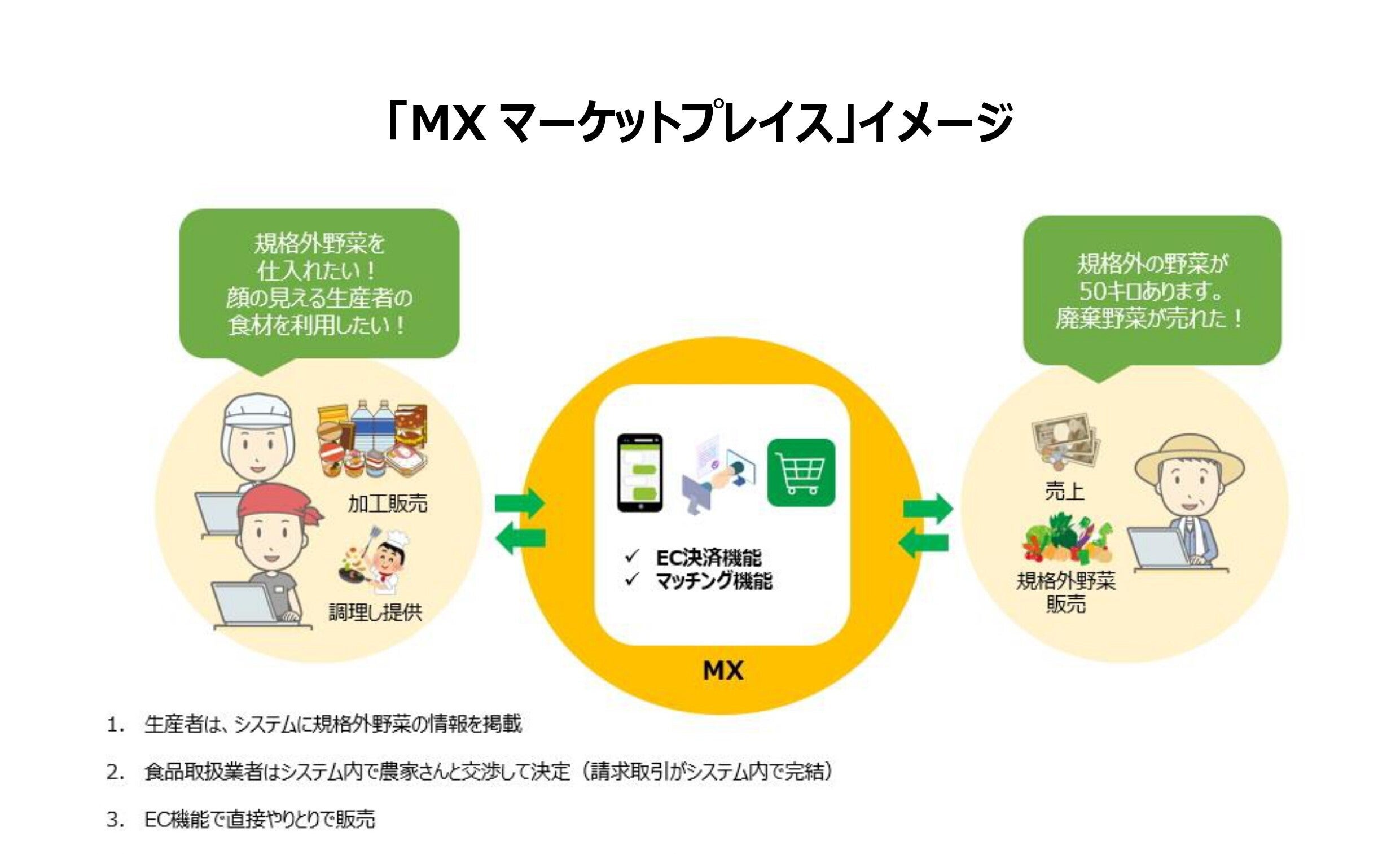 そこでMXが参加し、もったいないを減らしつつ、生産者と食関連ユーザーとつなぐ役割を担います。
