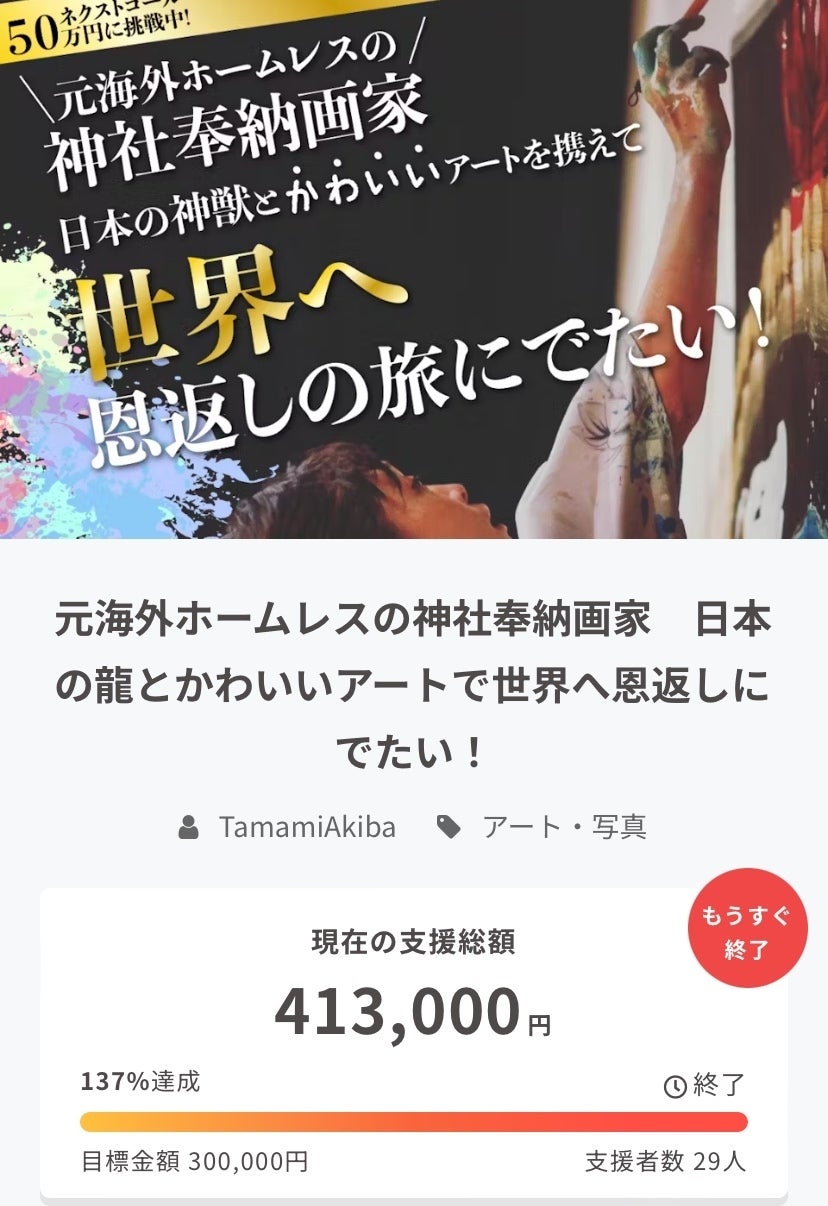 おかげさまで目標の30万円を達成できました! ありがとうございます。いただいた支援金は大切に使わせていただきます。 終了までまだ時間がありますので、今後はネクストゴール【50万円】にチャレンジします!