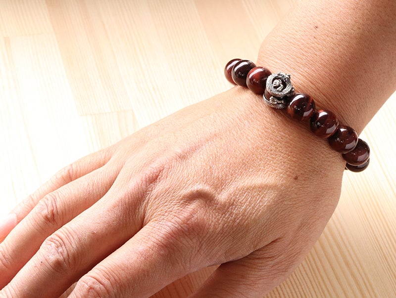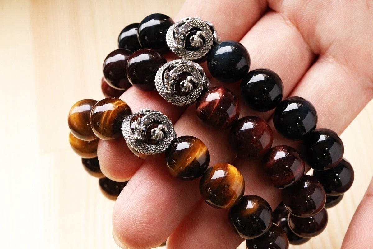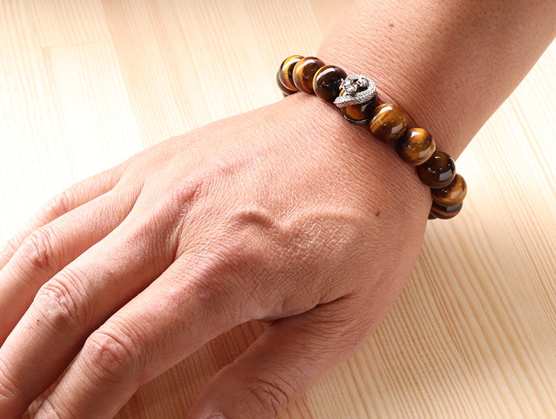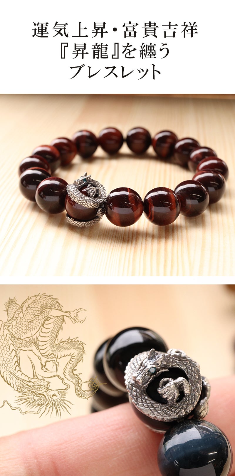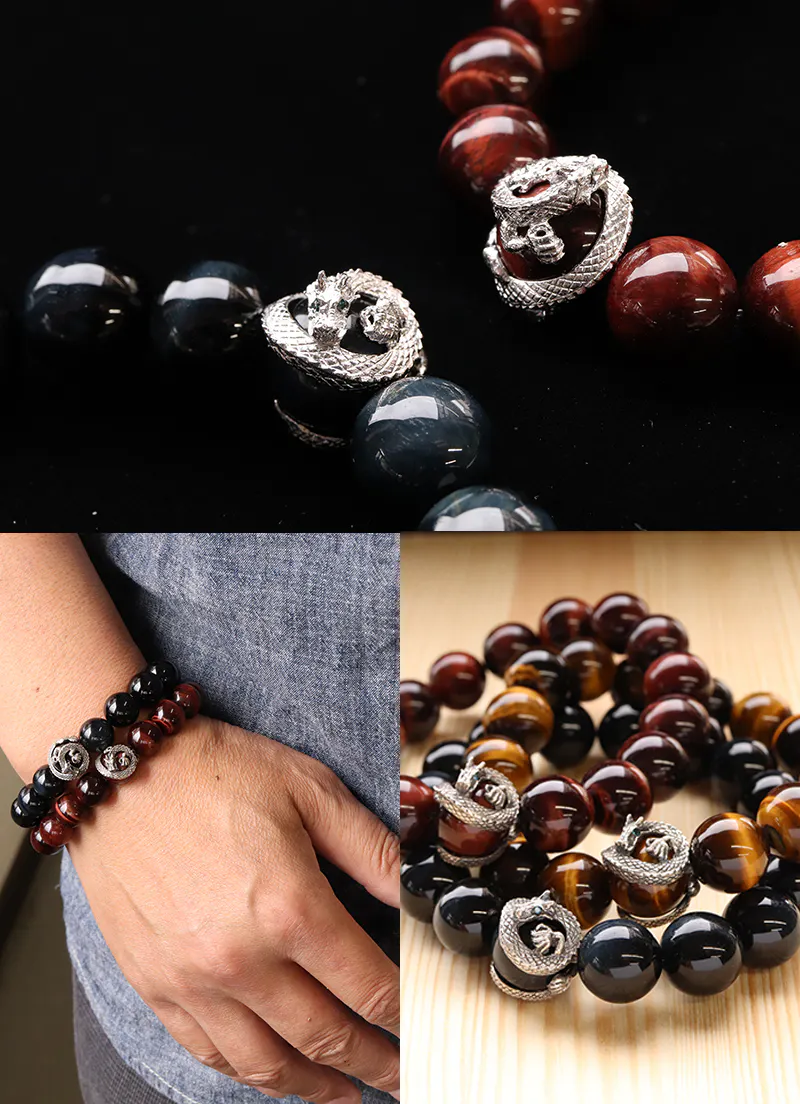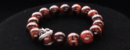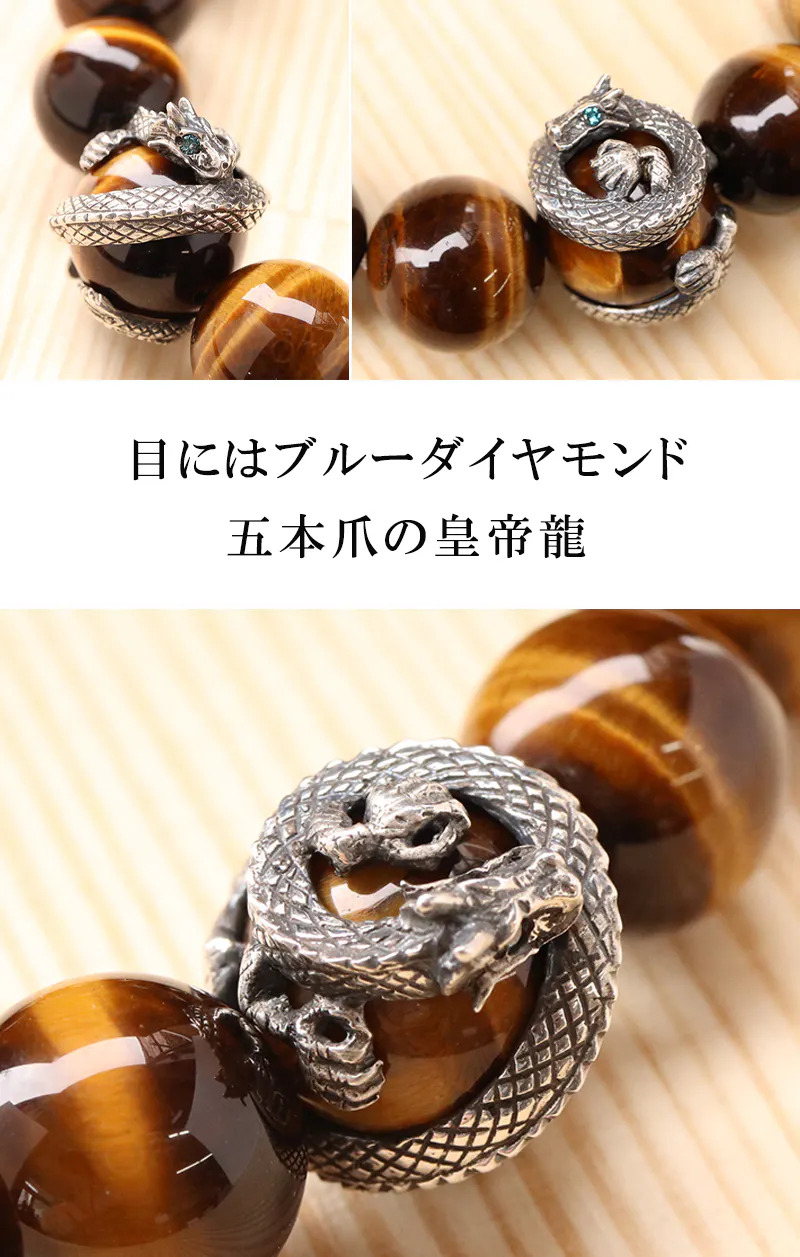 その龍を虎目石(タイガーアイ)と合わせた龍虎のブレスレットです。