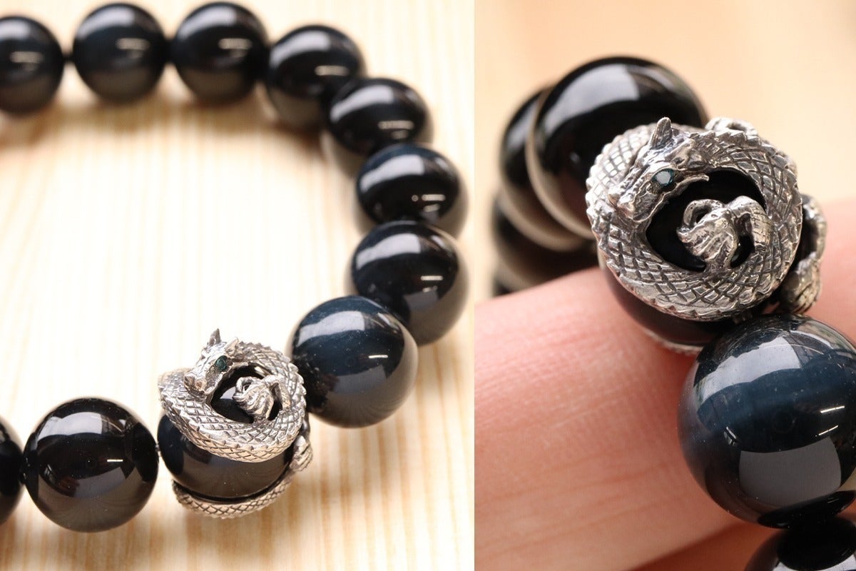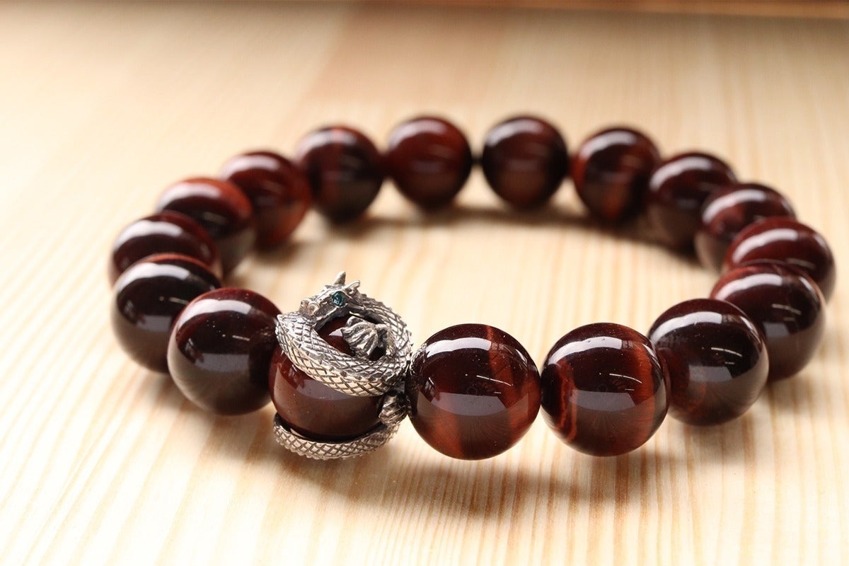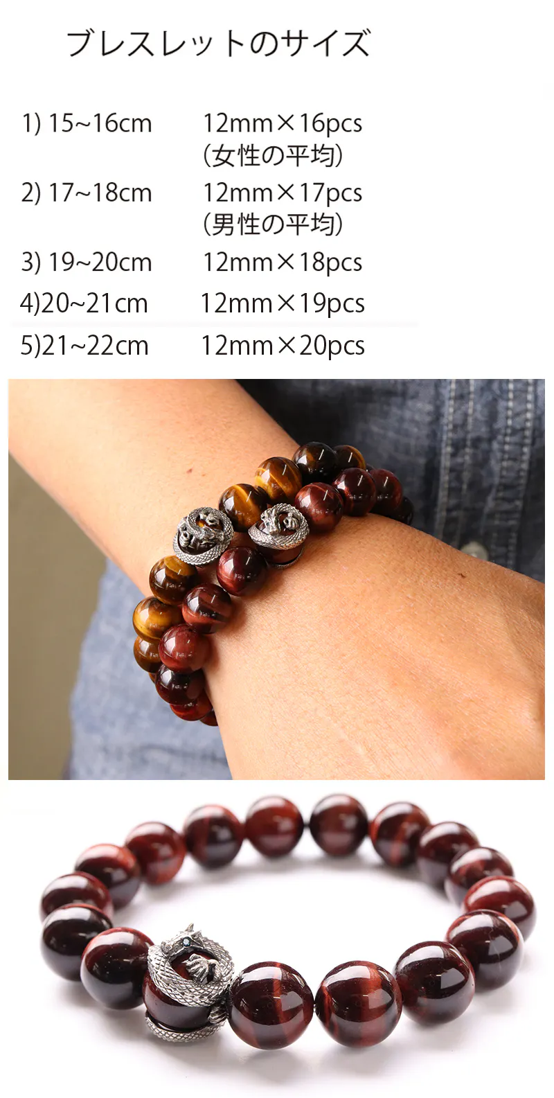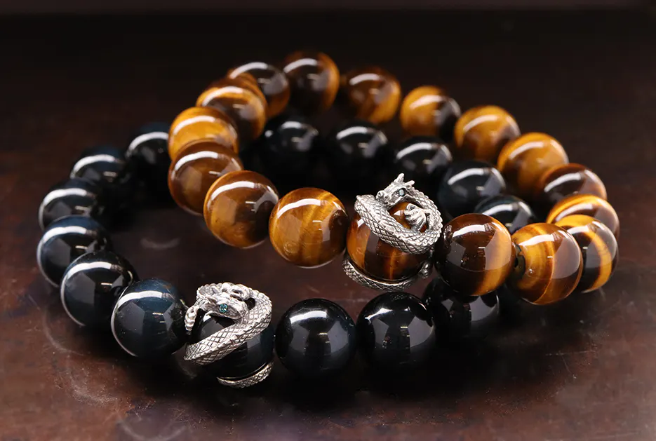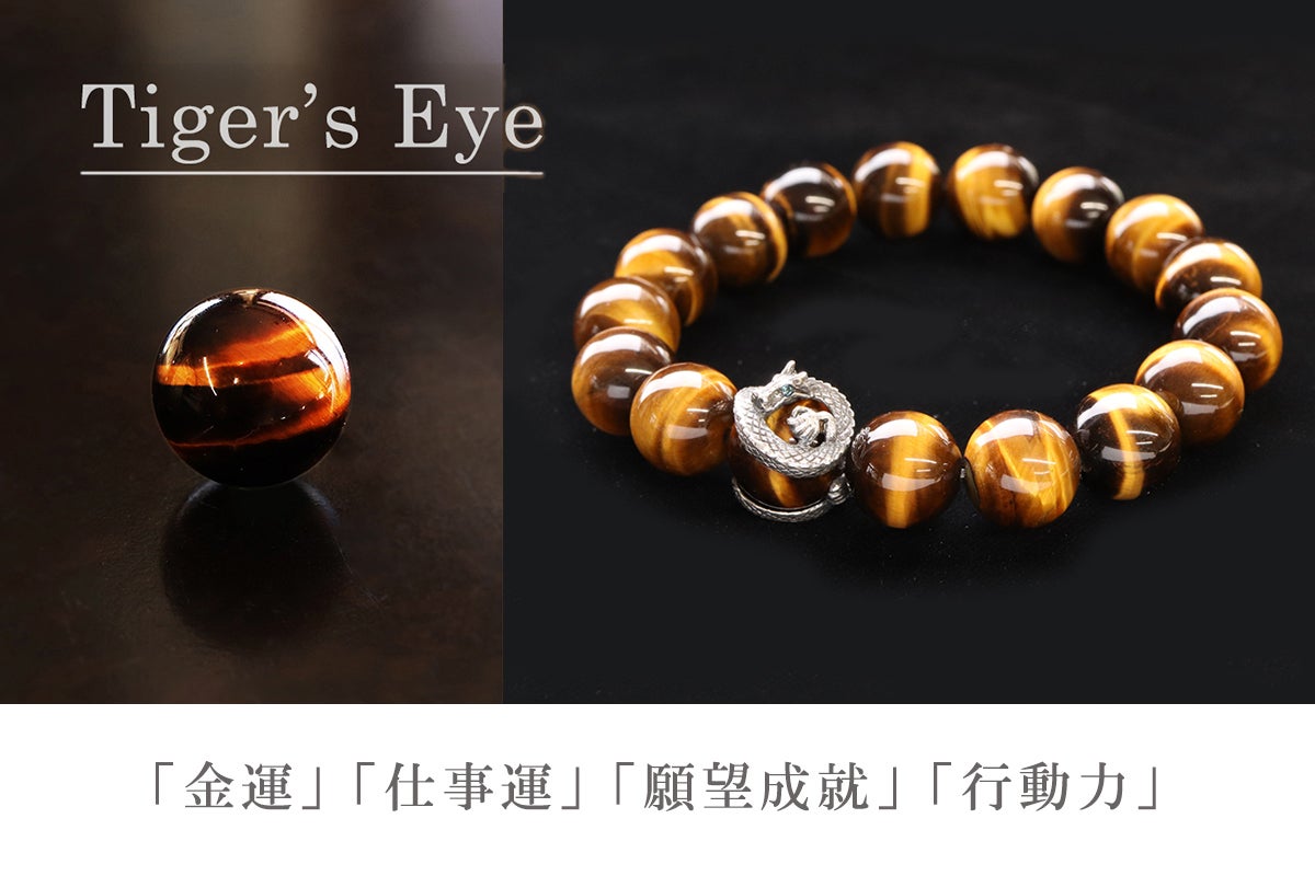 その龍を虎目石(タイガーアイ)と合わせた龍虎のブレスレットです。