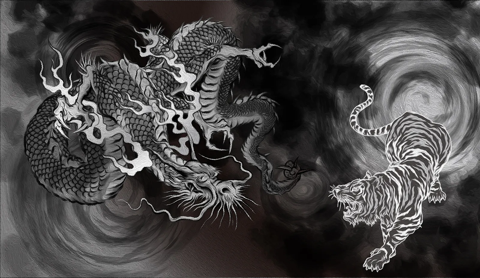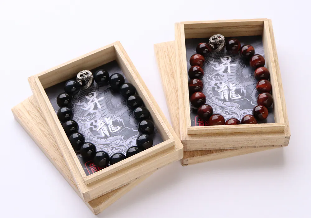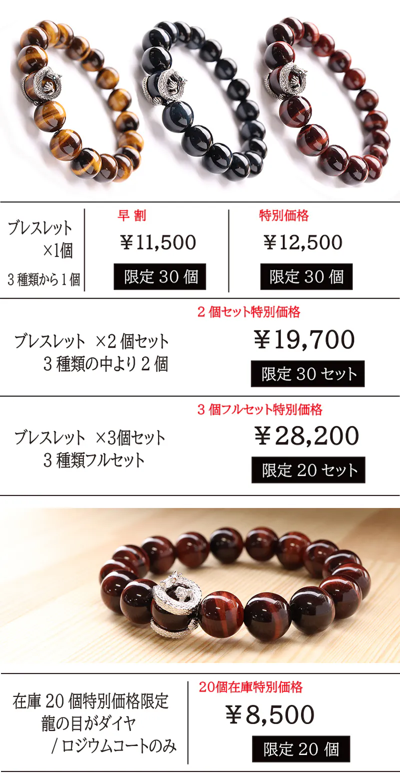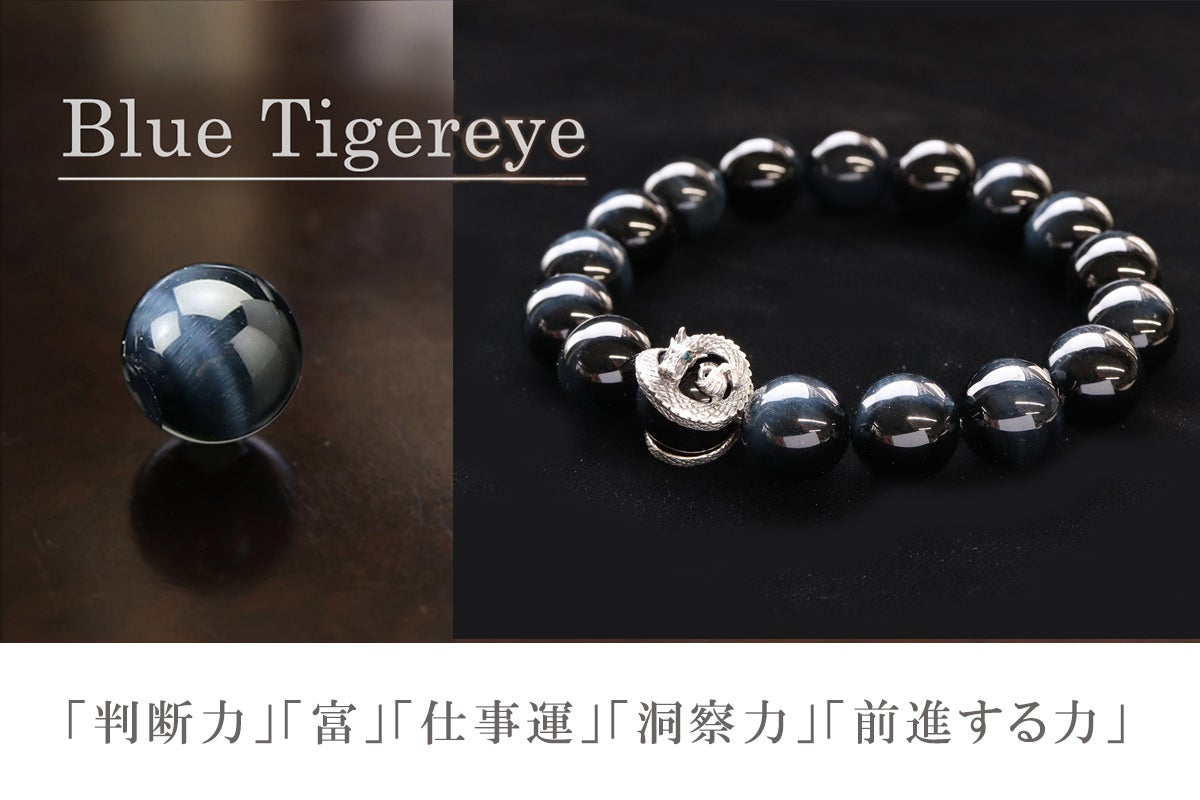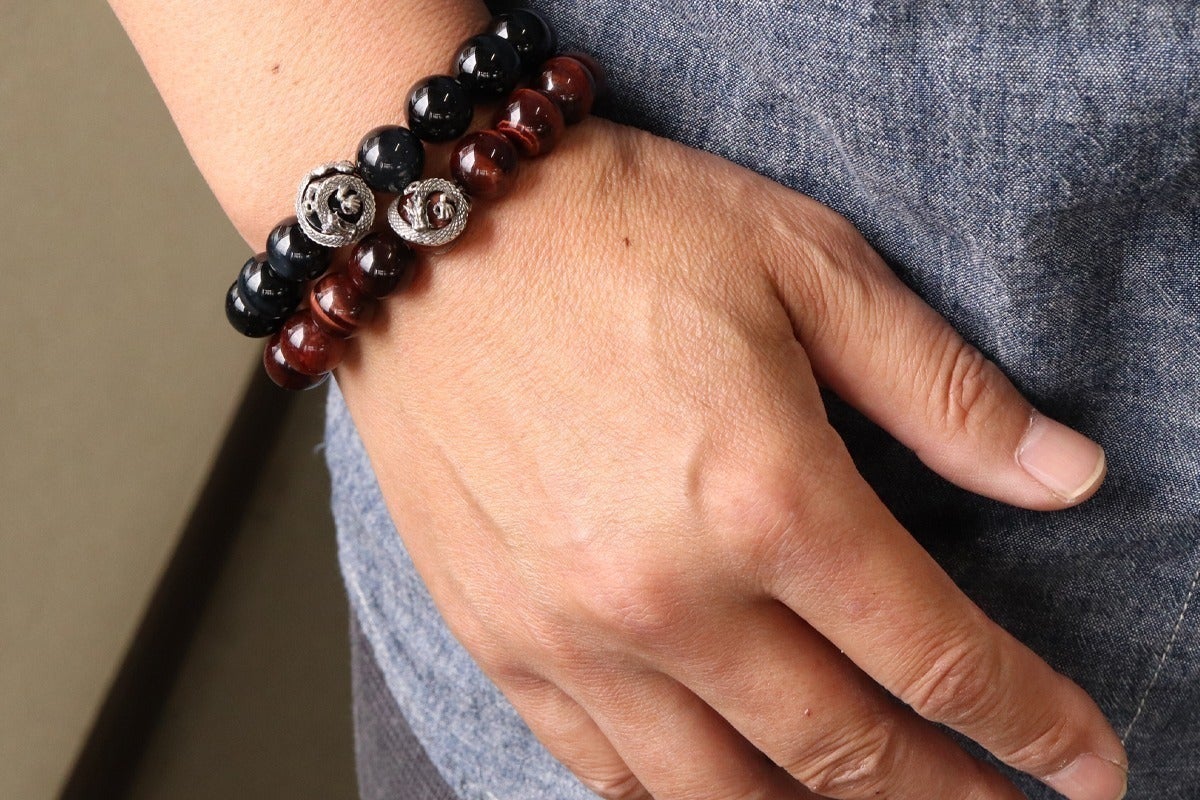 その龍を虎目石(タイガーアイ)と合わせた龍虎のブレスレットです。
