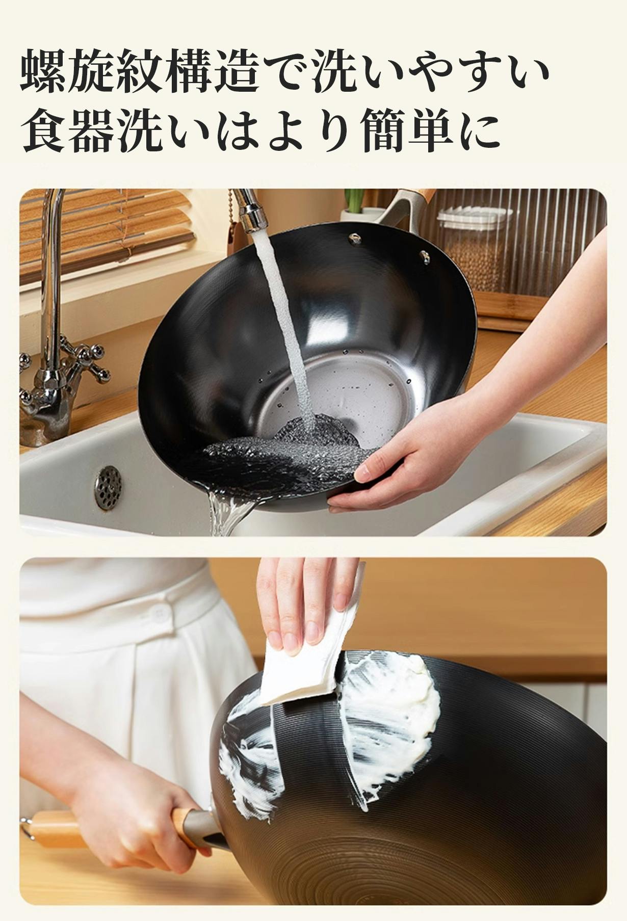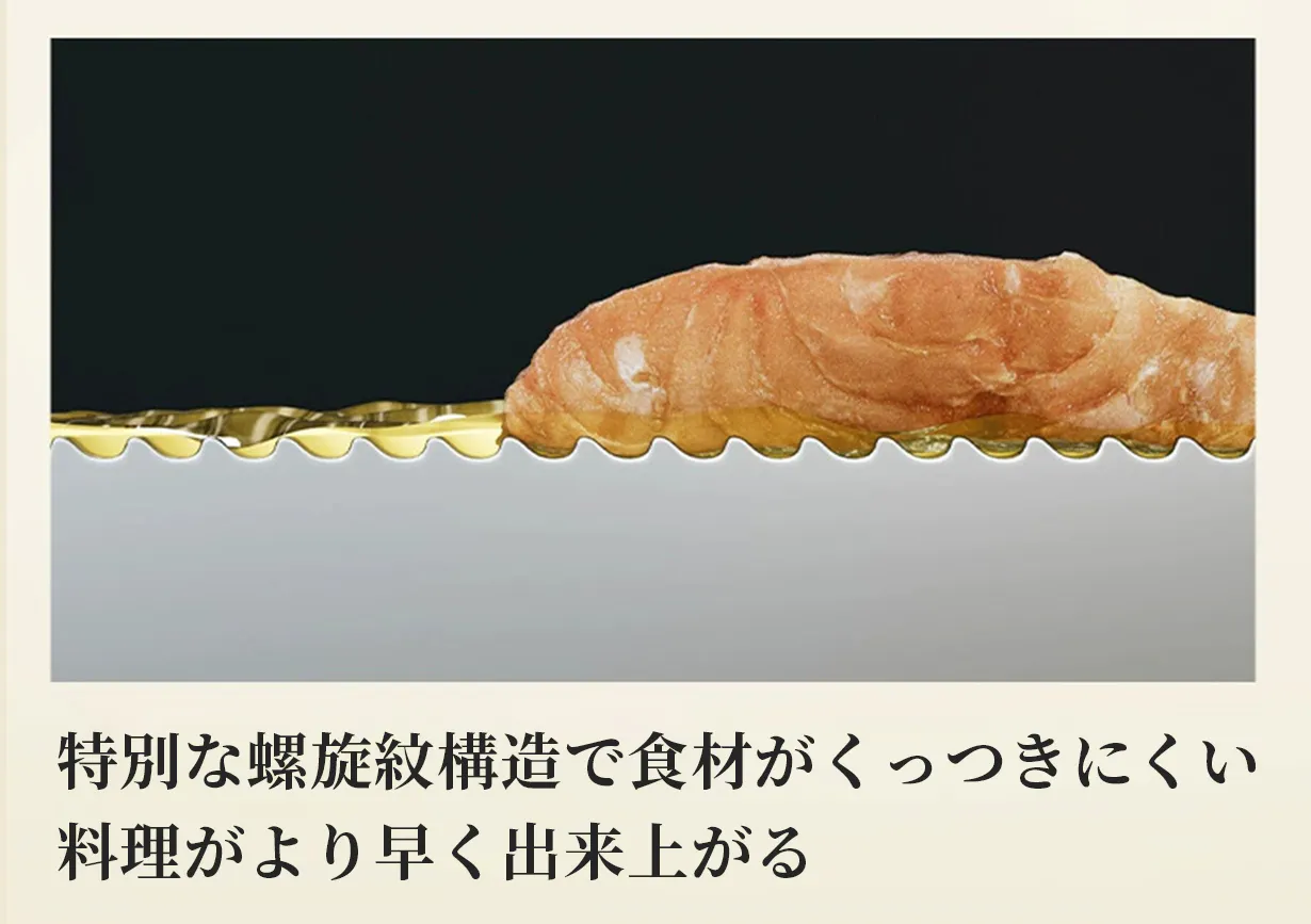 繊細で密な螺旋紋で油を均等に鍋に付着でき、細かい油膜を迅速につくり上げます。それで料理の時、入れた食材がくっつきにくい。
