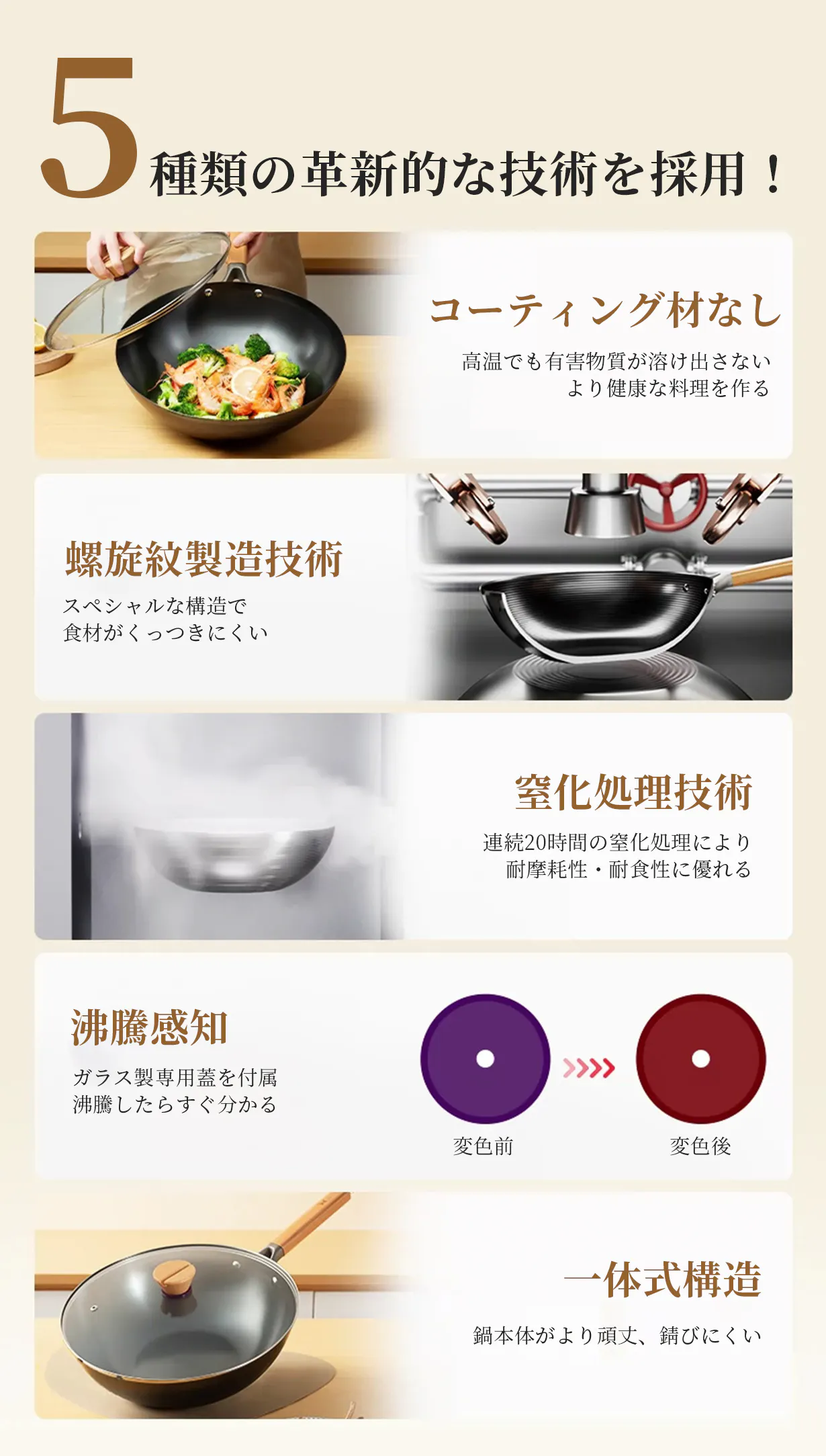 A3、はい、当社の中華鍋は連続20時間の窒化処理技術を採用しており、優れた耐摩耗性と耐食性を実現しています。そのため、長時間の使用にも耐え、錆びにくい構造となっております。