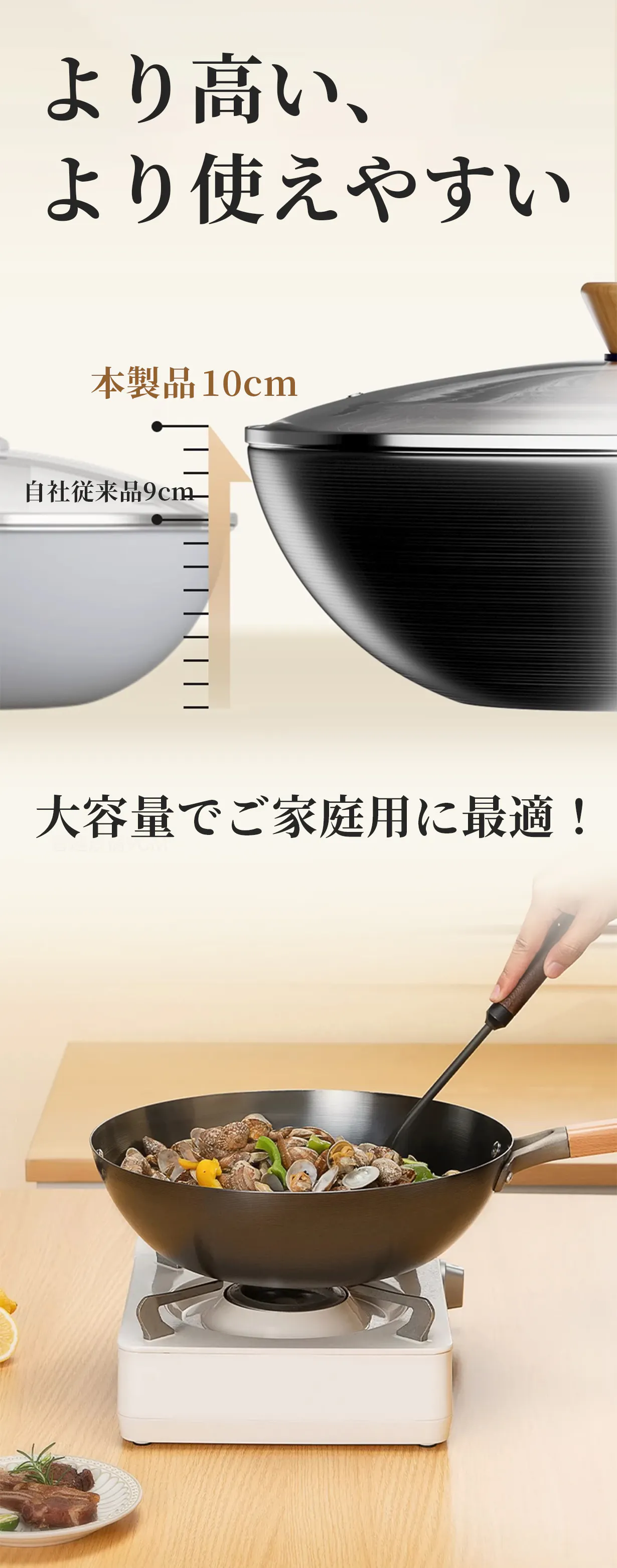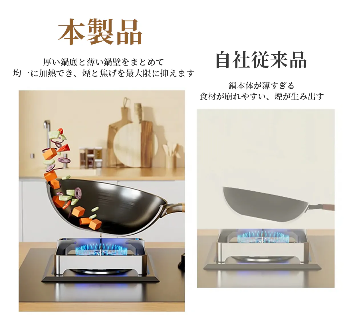 一体式構造なので、厚い鍋底と薄い鍋壁をまとめます。それにより、鍋本体を均一に加熱でき、根本的に煙と焦げを最大限に抑えます。