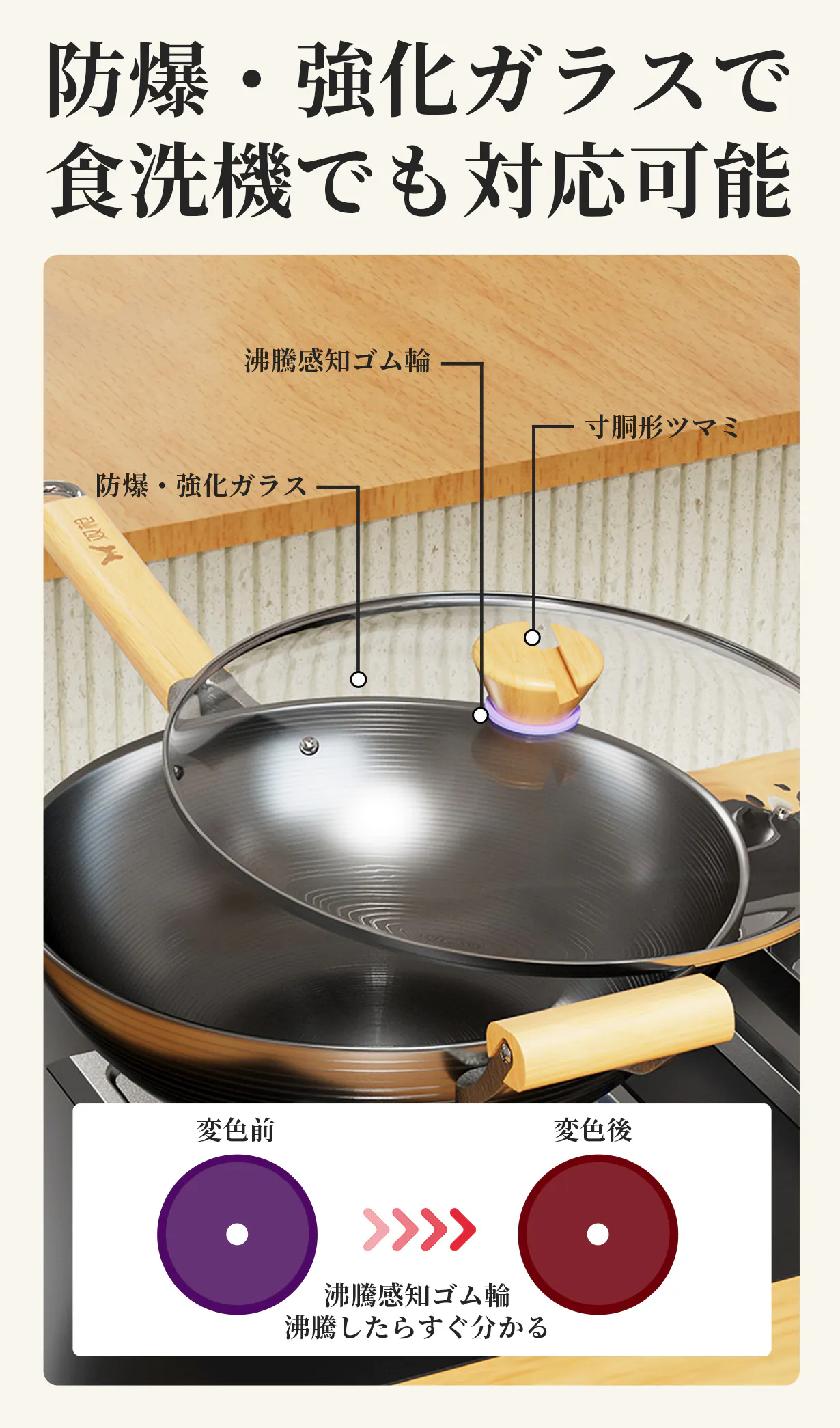 防爆・強化ガラスで制作される専用鍋蓋を付属することで、入れた食材をちゃんと見えまして、より安全にクッキングします。沸騰感知ゴム輪が付きて、水が沸騰したらすぐ分かる。それで食材の焼き加減を随時に把握でき、火傷のリスクも低くなります。
