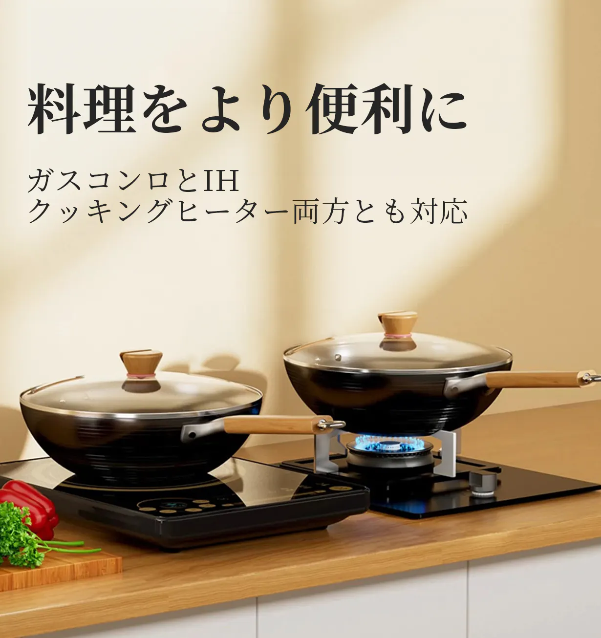 本製品はガスコンロとIH クッキングヒーター両方とも対応できます。どのような場合でも料理を便利に作れます。